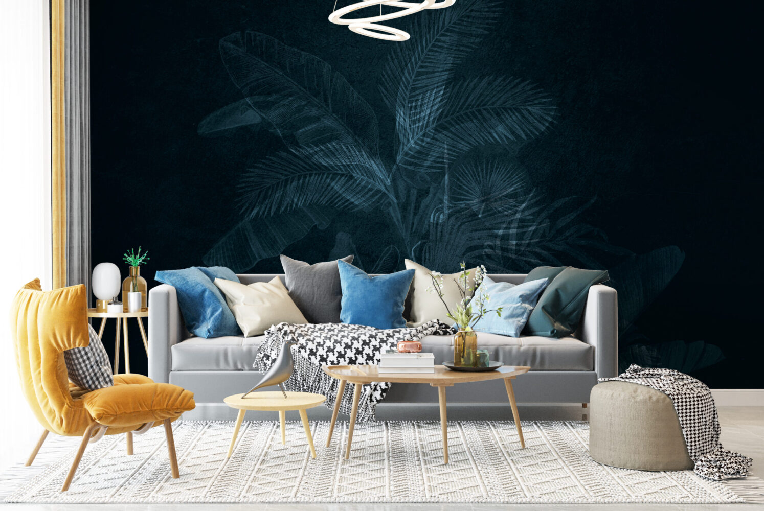 Mavi Tonlar'da Tropikal Yapraklar Duvar Kağıdı