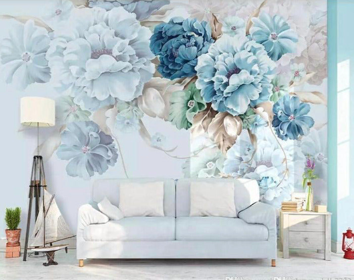 Mavi Tonlardaki Büyük Gül Desenli 3D Duvar Kağıdı