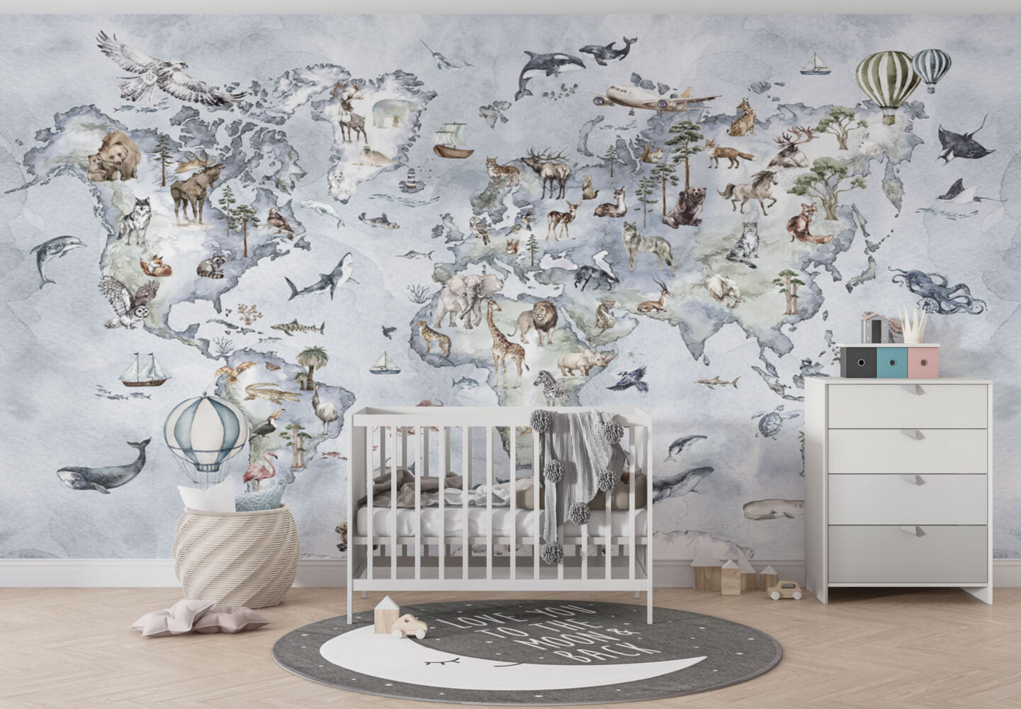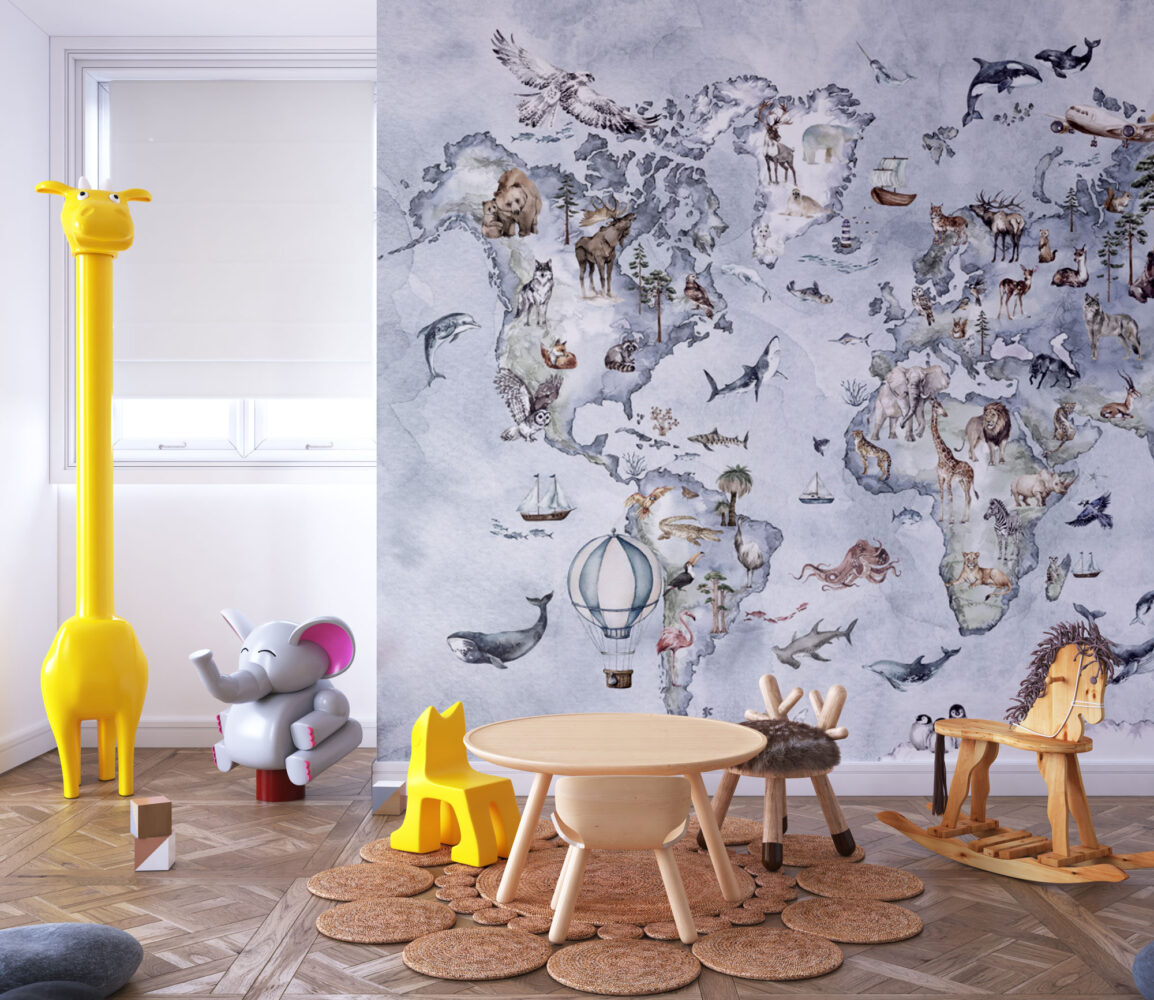 Mavi Tonların'da Hayvanlı Dünya Harita 3D Duvar Kağıdı Duvar Kağıdı Ürün Bilgisi