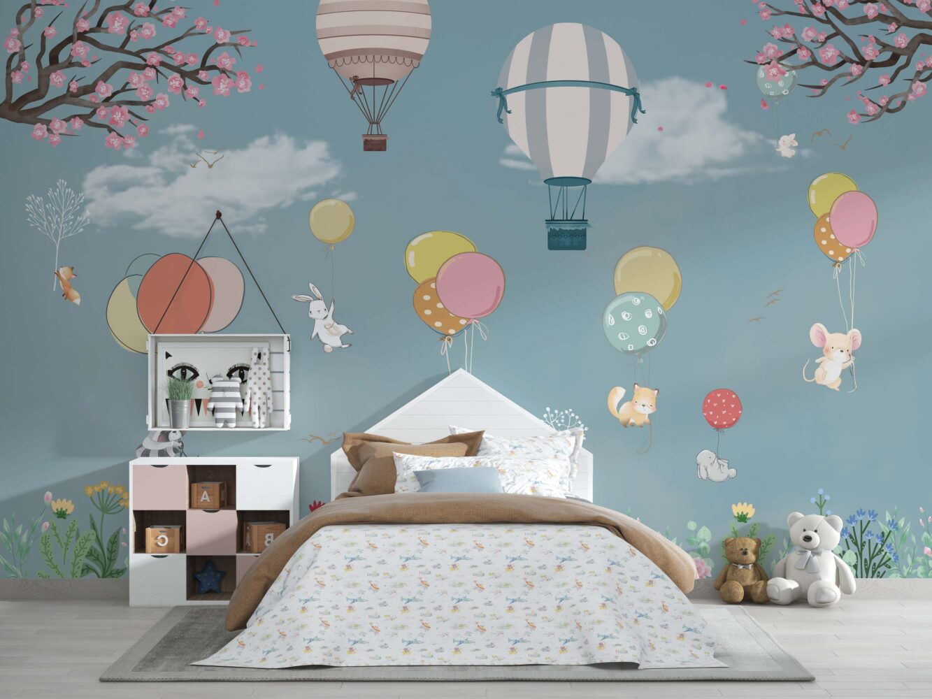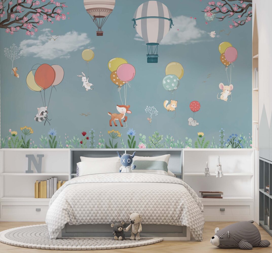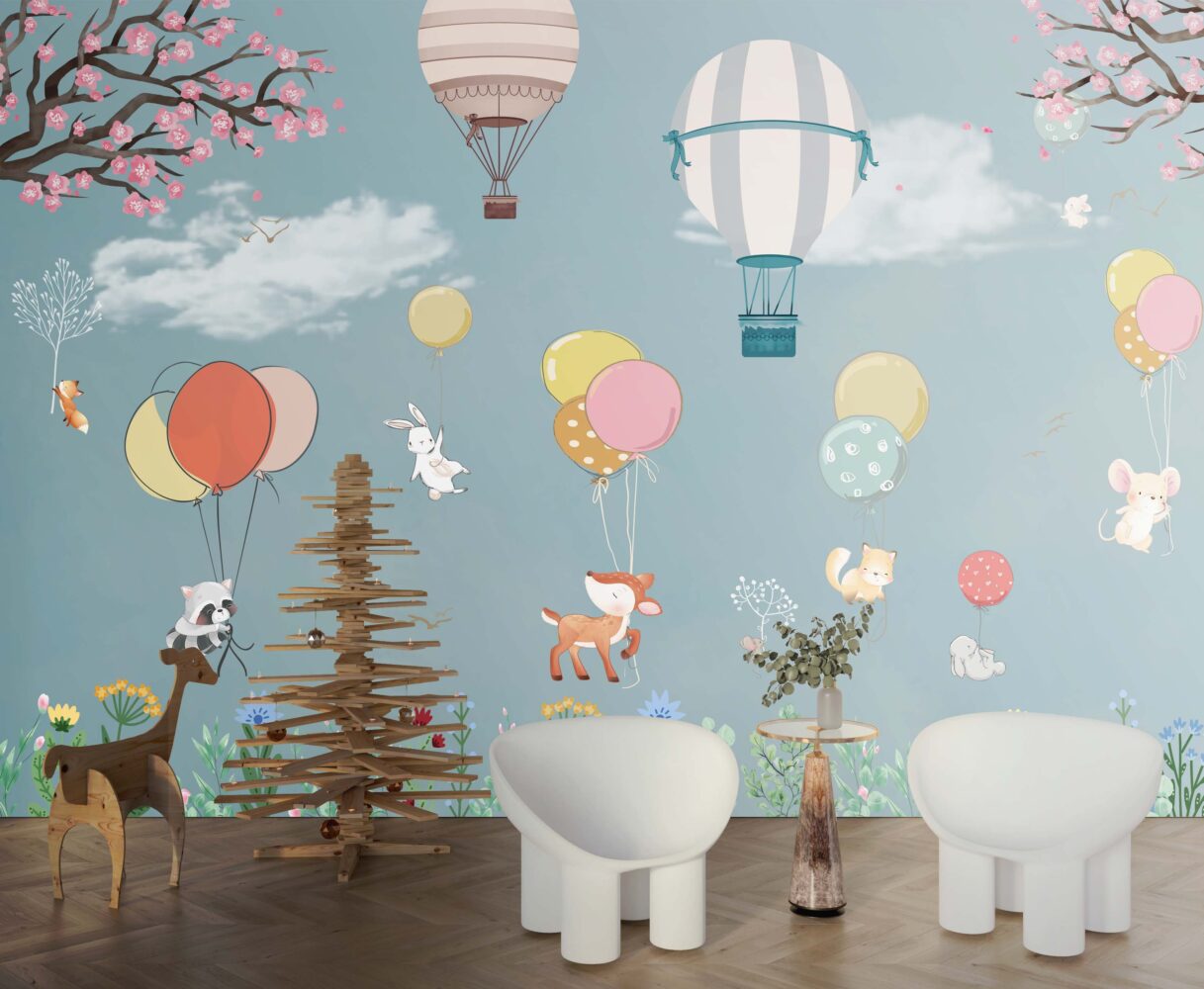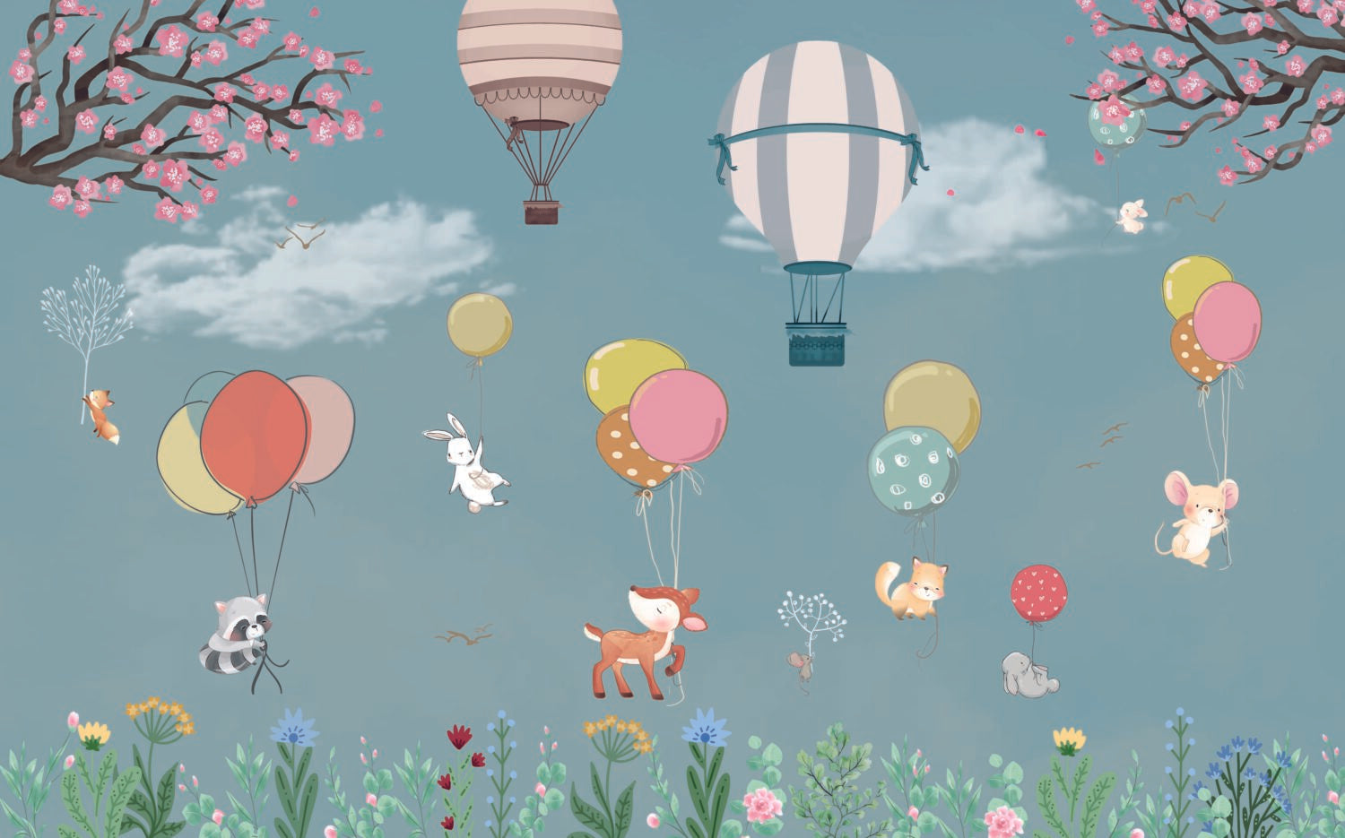 Mavi Zemin Renginde Uçan Balonlu Hayvanlar 3D Duvar Kağıdı Duvar Kağıdı Ürün Bilgisi