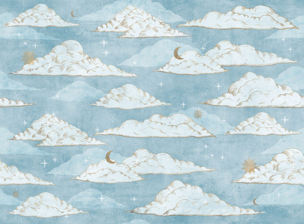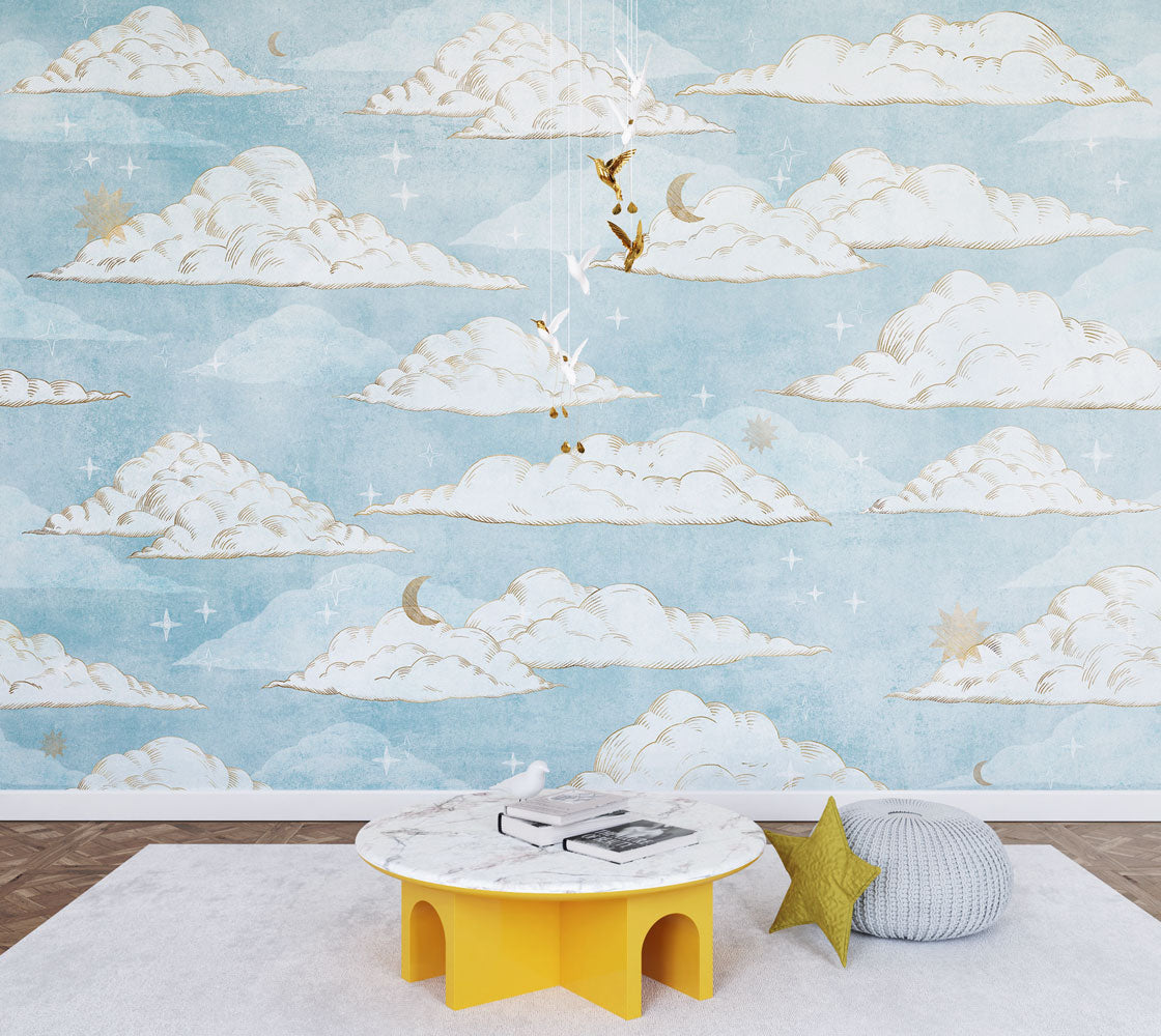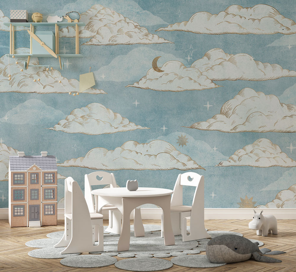 Mavi Zemin'li Ay Yıldız ve Bulut Desenli 3D Duvar Kağıdı