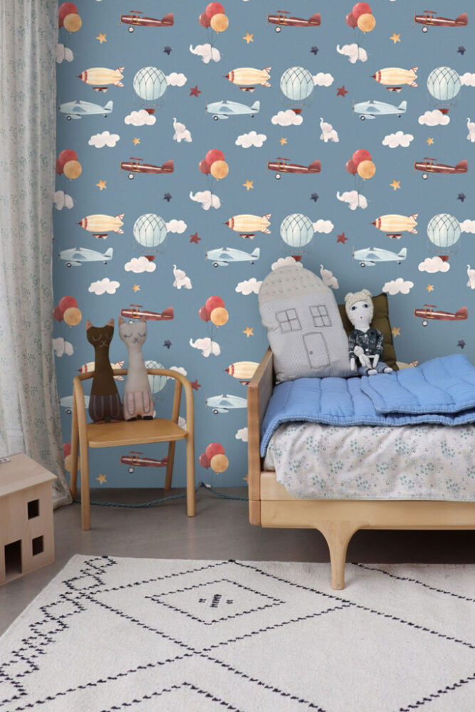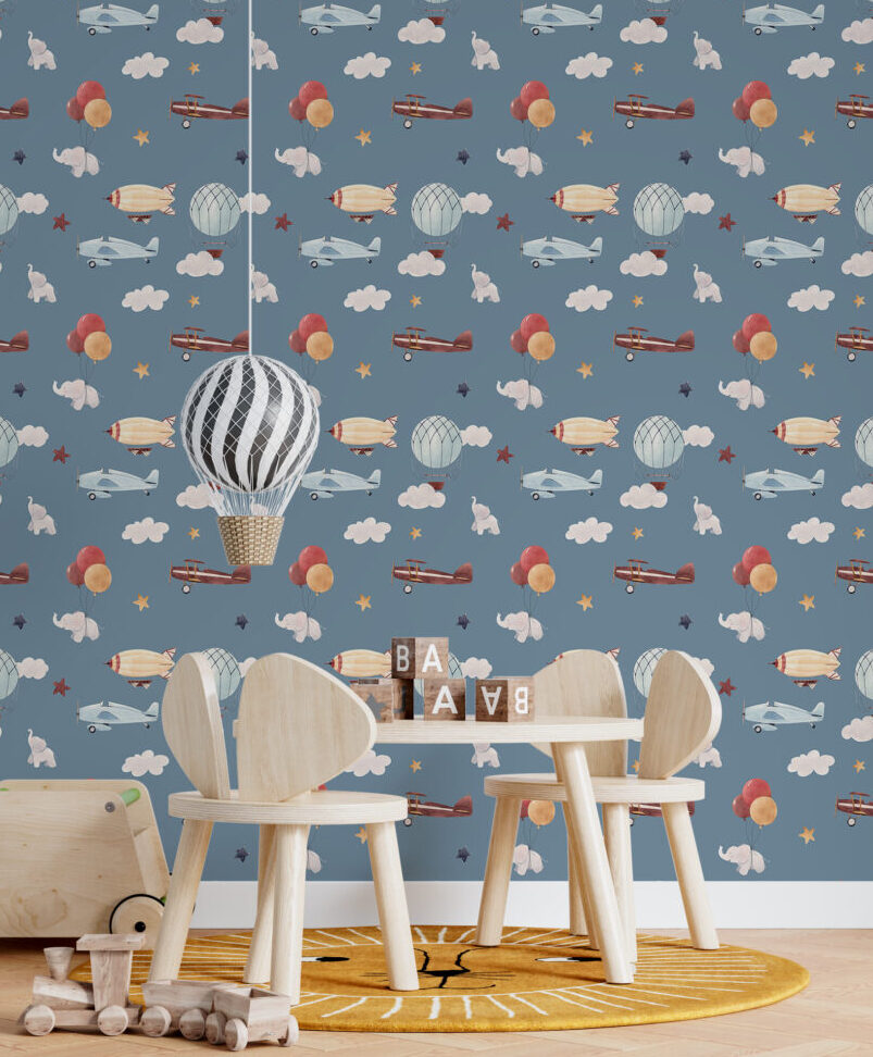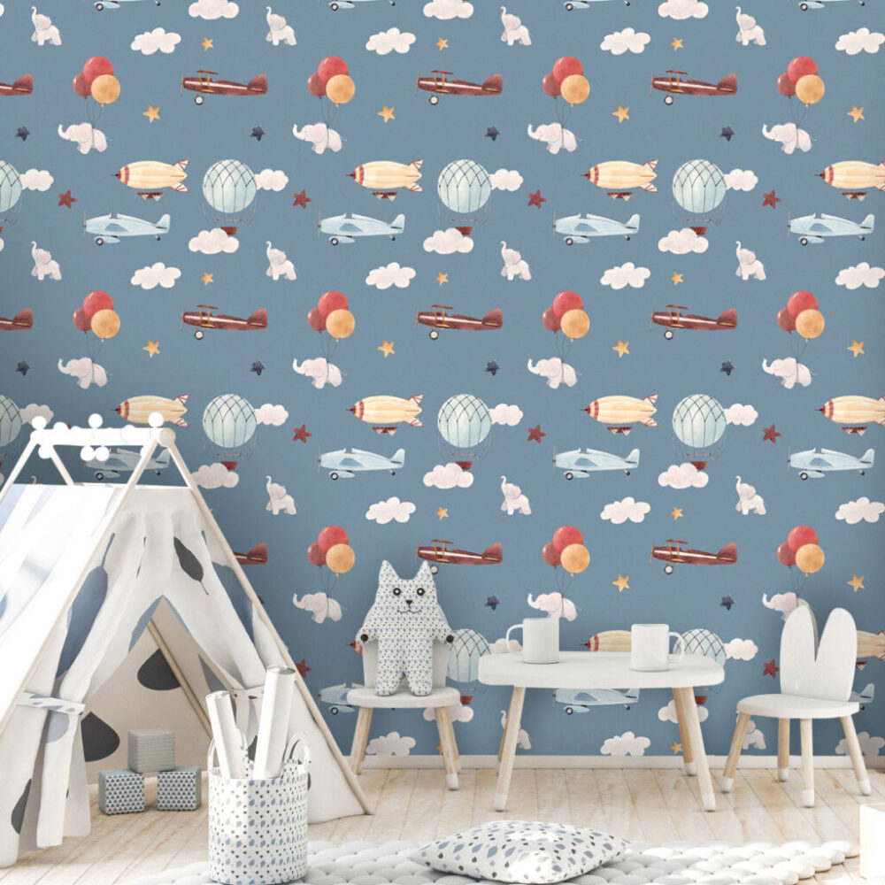 Mavi Zemin'li Uçak Balon ve Bulut Desenli 3D Duvar Kağıdı Duvar Kağıdı Ürün Bilgisi