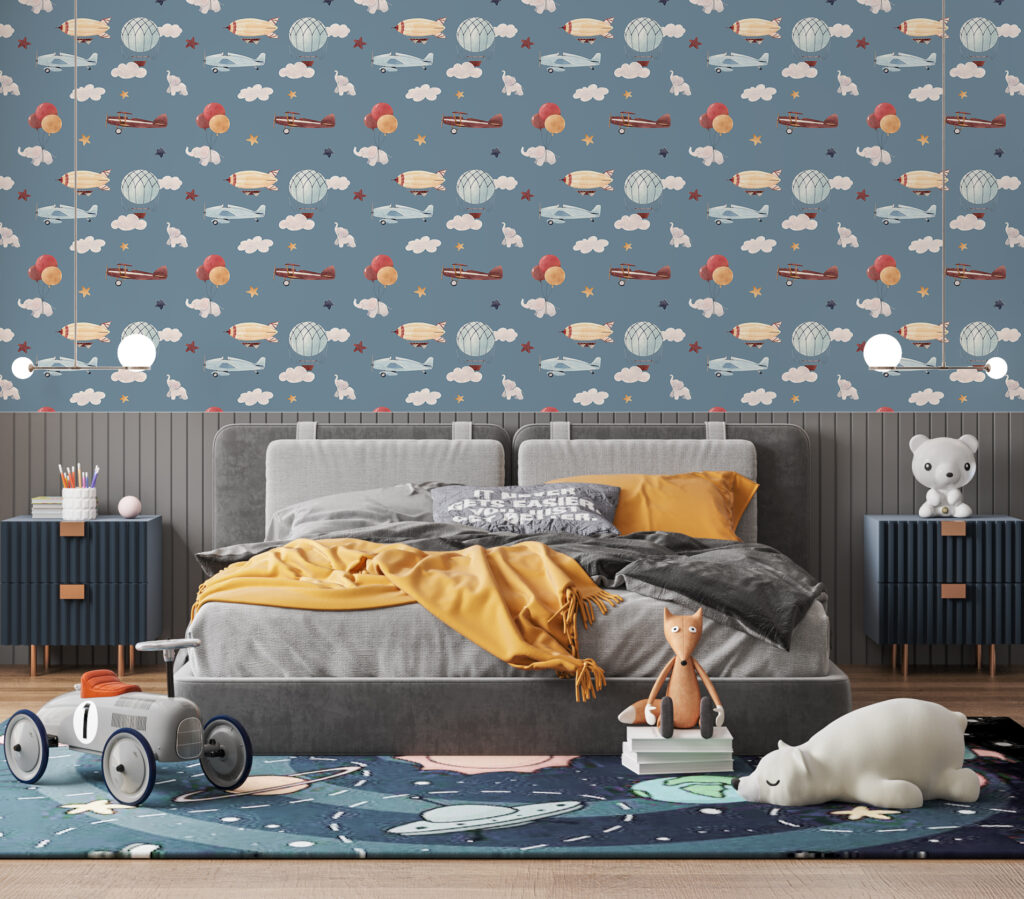 Mavi Zemin'li Uçak Balon ve Bulut Desenli 3D Duvar Kağıdı üretimi, uygulanmasını isteyeceğiniz boyut ve konumuna uygun olarak talepleriniz doğrultusunda size özel imal edilir.