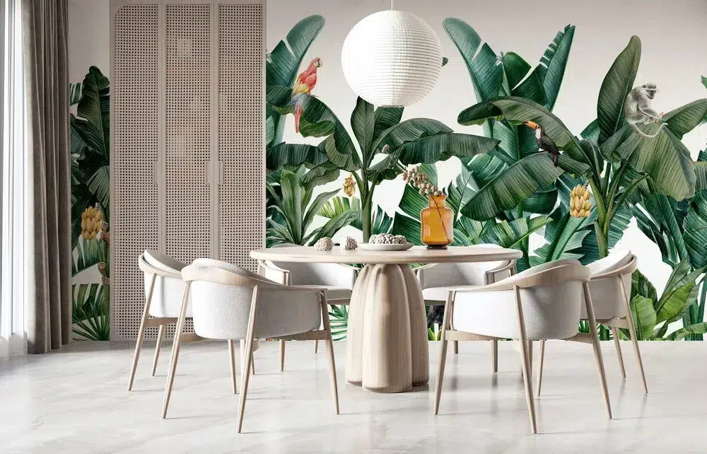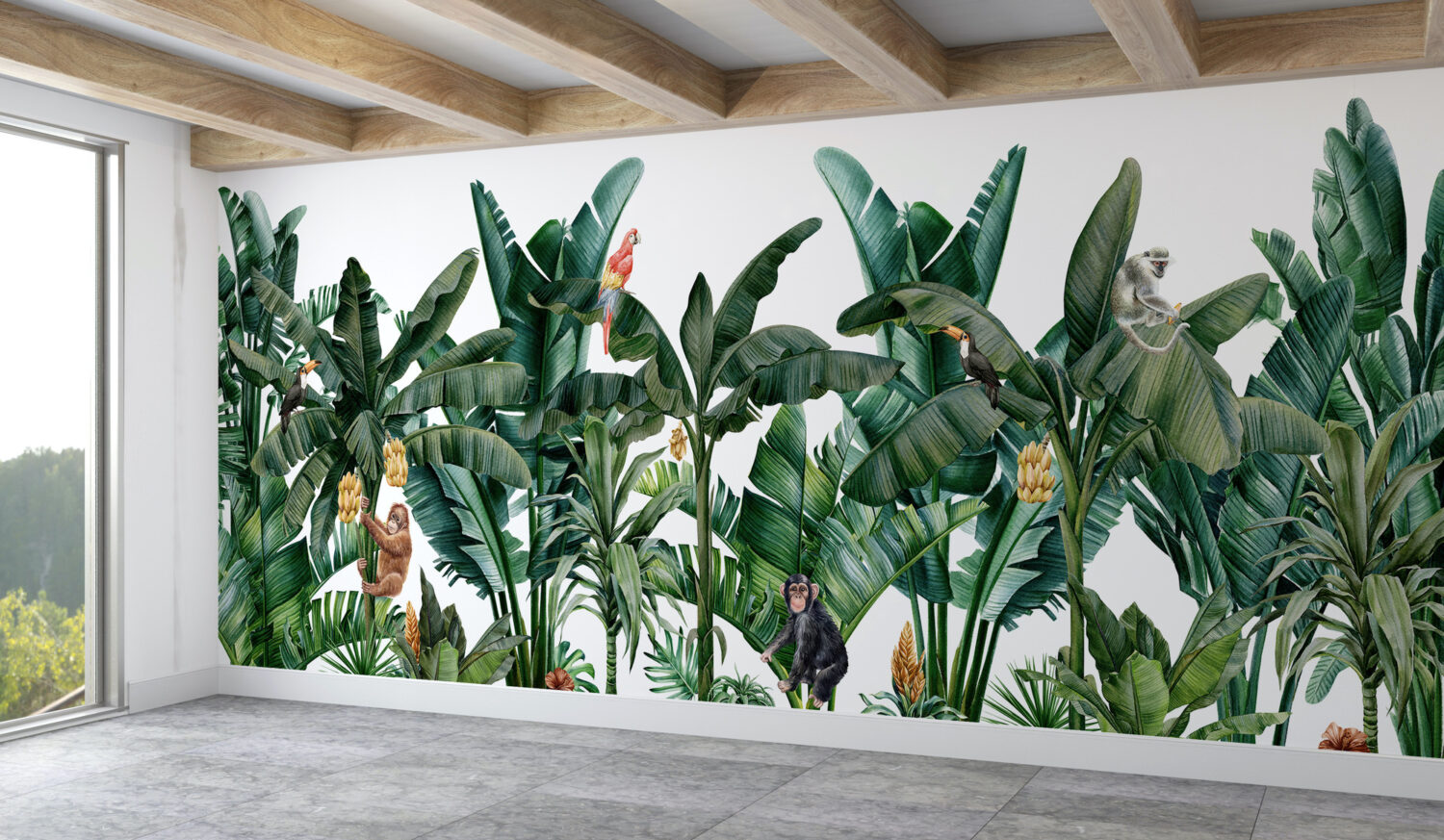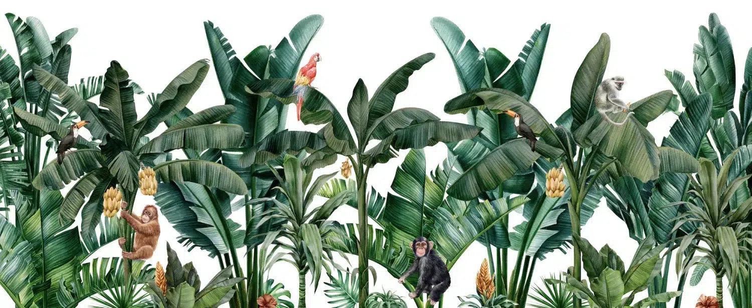 Muz Ağaçlarındaki Hayvanlar Tropikal Duvar Kağıdı üretimi, uygulanmasını isteyeceğiniz boyut ve konumuna uygun olarak talepleriniz doğrultusunda size özel imal edilir.