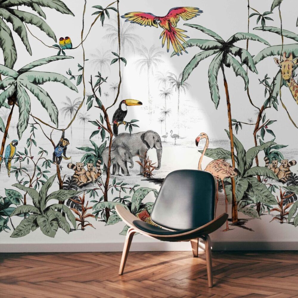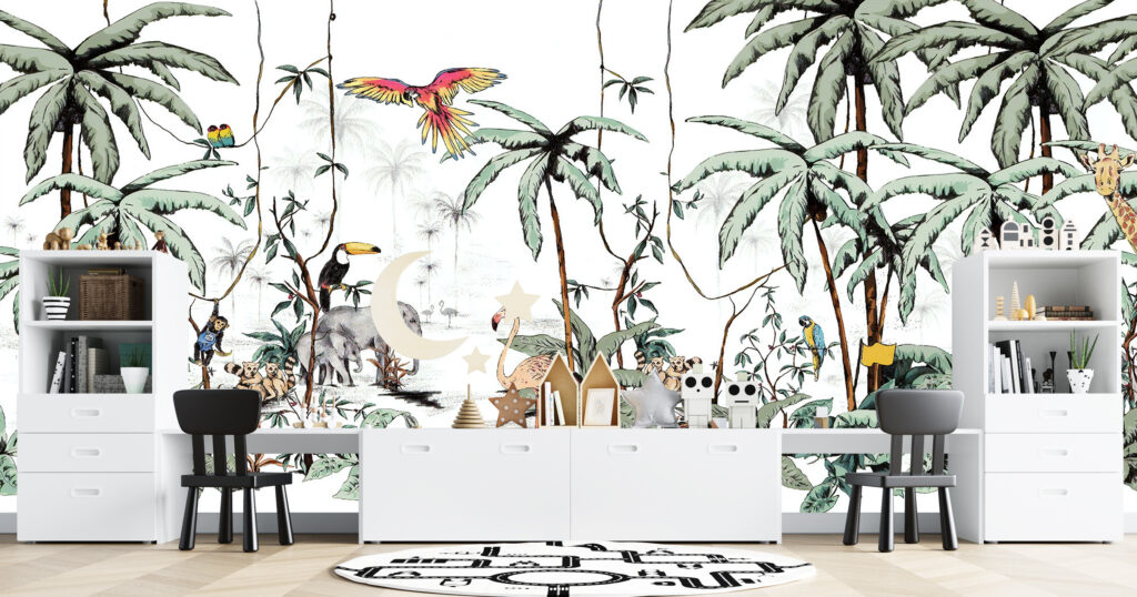 Palmiye Ağacı Altında Hayvan Desenli 3D Duvar Kağıdı