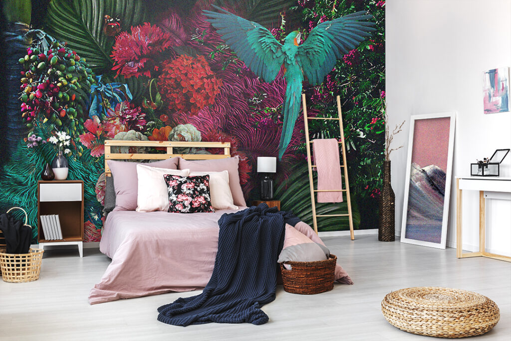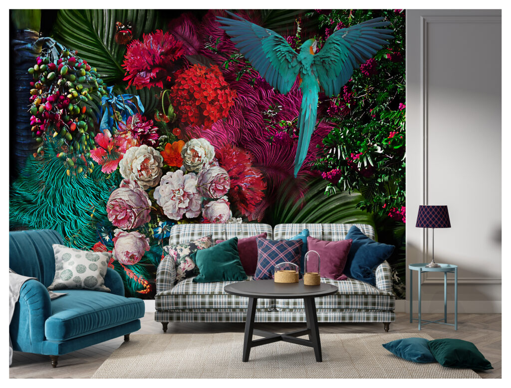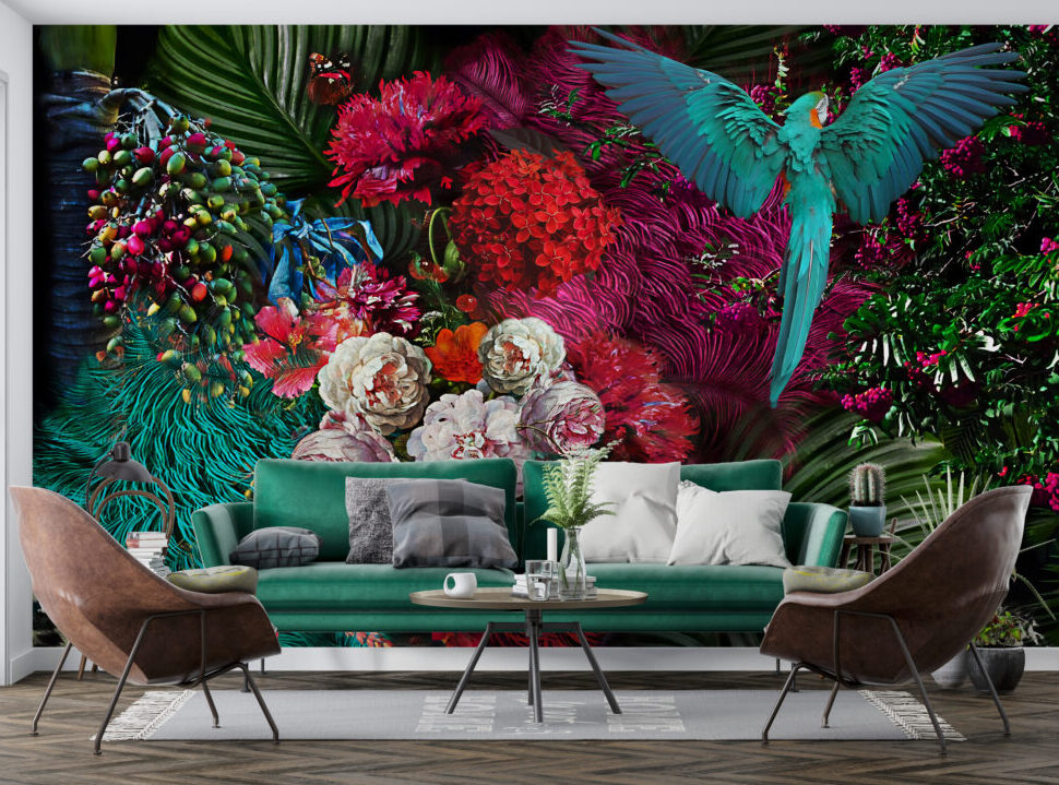 Papağan ve Renkli Çiçek Desenli 3D Duvar Kağıdı üretimi, uygulanmasını isteyeceğiniz boyut ve konumuna uygun olarak talepleriniz doğrultusunda size özel imal edilir.