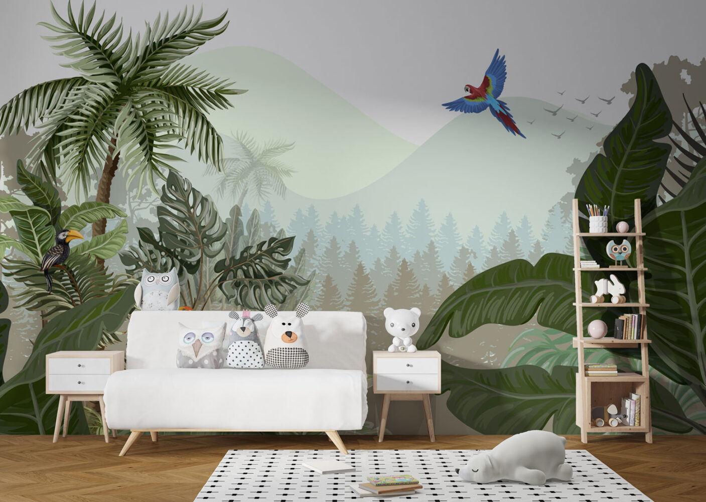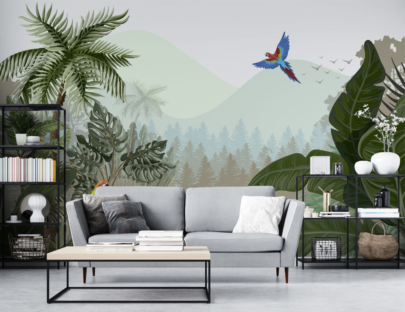 Papağanlar ve Tropikal Orman Manzarası Duvar Kağıdı üretimi, uygulanmasını isteyeceğiniz boyut ve konumuna uygun olarak talepleriniz doğrultusunda size özel imal edilir.