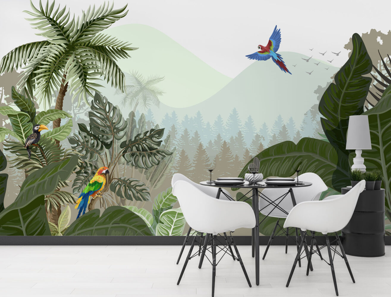 Papağanlar ve Tropikal Orman Manzarası Duvar Kağıdı Duvar Kağıdı Ürün Bilgisi