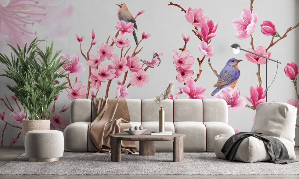 Pembe Çiçekli Daldaki Kuş Desenli 3D Duvar Kağıdı