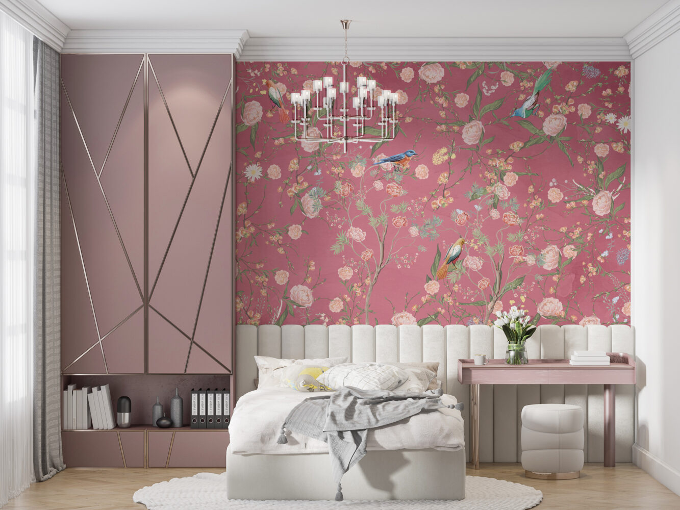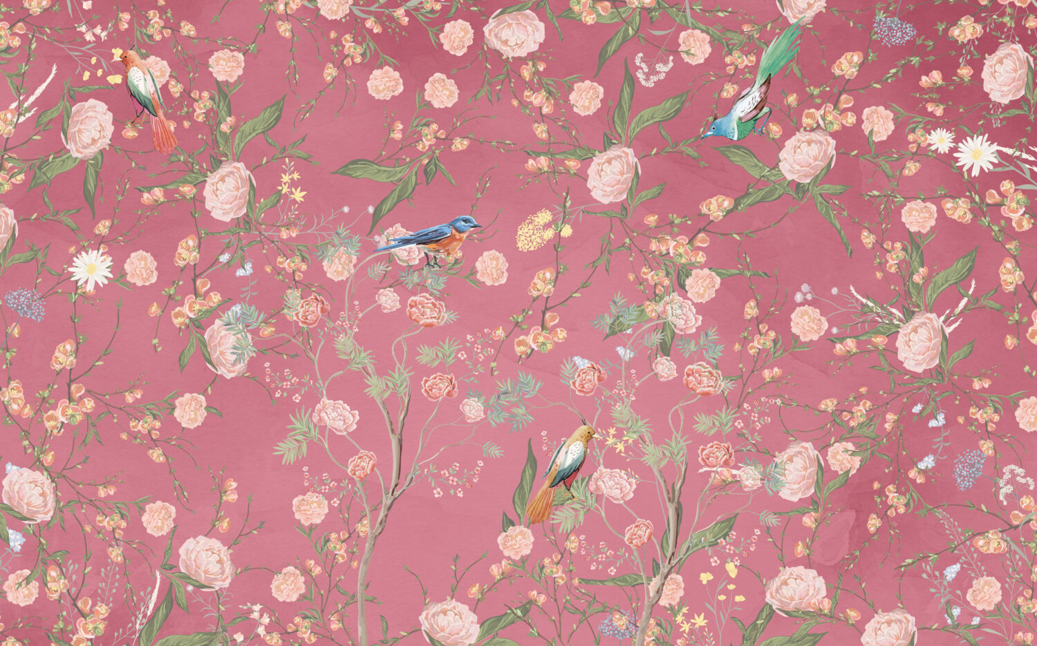 Pembe Zeminli Kuşlar Ve Çicekler Duvar Kağıdı Duvar Kağıdı Ürün Bilgisi