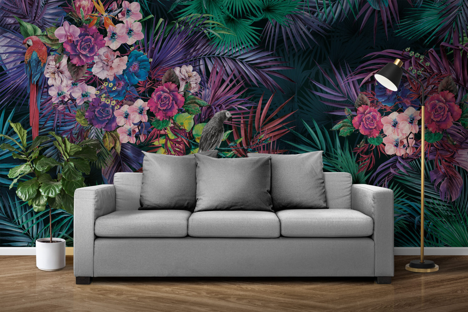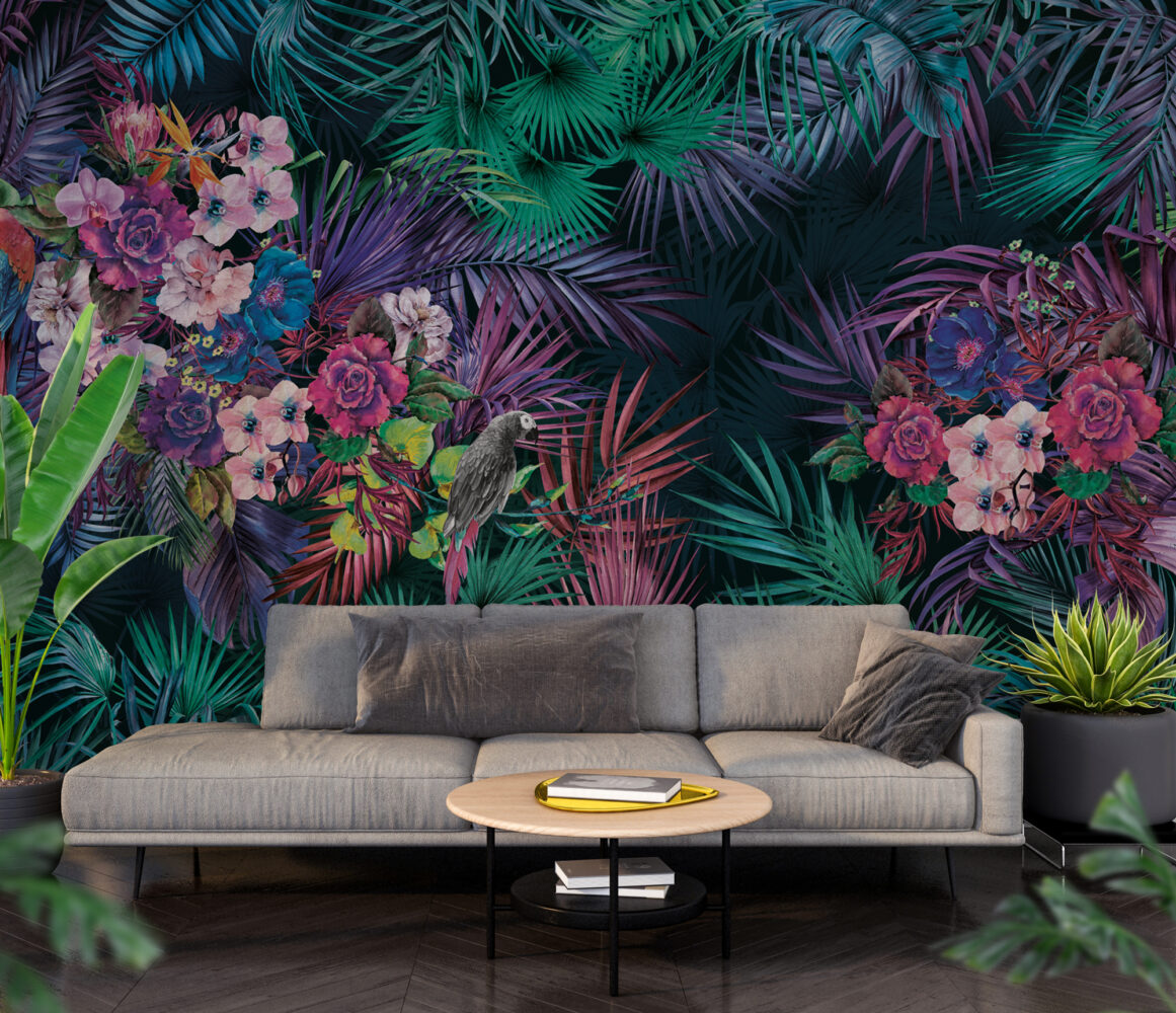 Rengarenk Çicekler ve Tropikal Yapraklar Üzerinde Papağan 3D Duvar Kağıdı