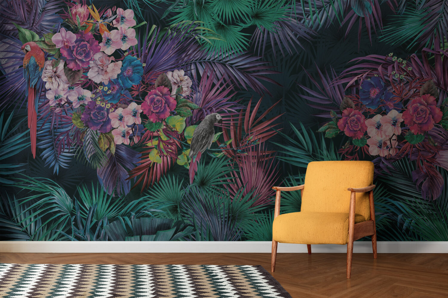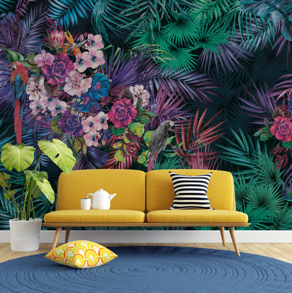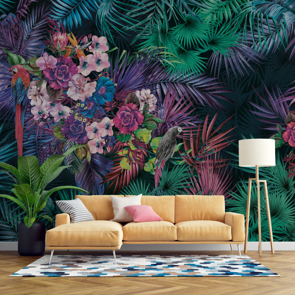 Rengarenk Çicekler ve Tropikal Yapraklar Üzerinde Papağan 3D Duvar Kağıdı üretimi, uygulanmasını isteyeceğiniz boyut ve konumuna uygun olarak talepleriniz doğrultusunda size özel imal edilir.