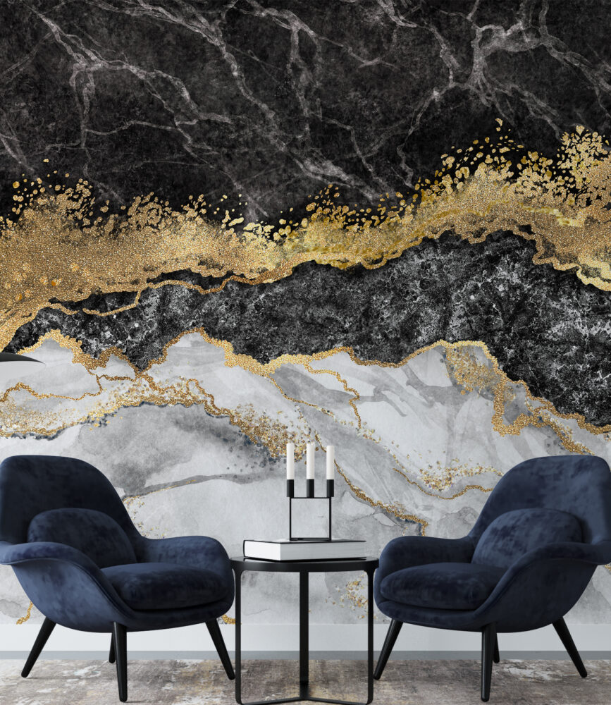 Renk Geçişli Siyah Beyaz Altın Detaylı Mermer Duvar Kağıdı | Duvar Kağıdı Marketi üretimi, uygulanmasını isteyeceğiniz boyut ve konumuna uygun olarak talepleriniz doğrultusunda size özel imal edilir.