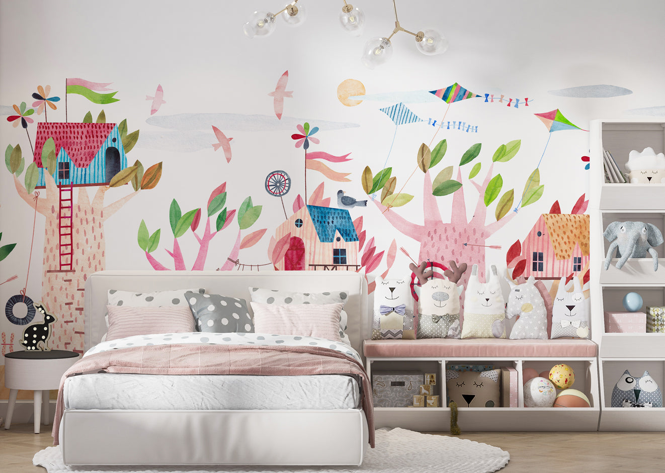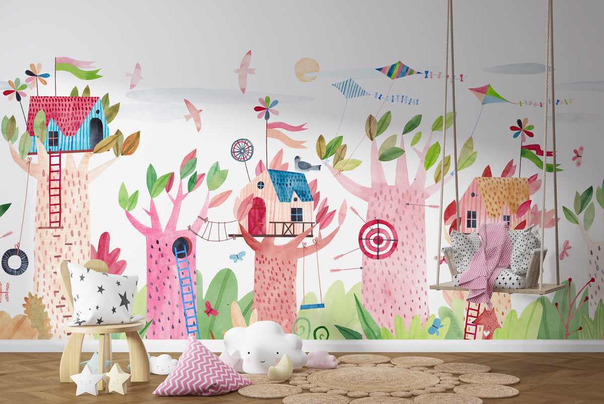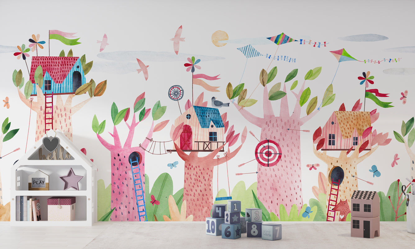 Renkli Ağaç Evler Duvar Kağıdı | Duvar Kağıdı Marketi üretimi, uygulanmasını isteyeceğiniz boyut ve konumuna uygun olarak talepleriniz doğrultusunda size özel imal edilir.