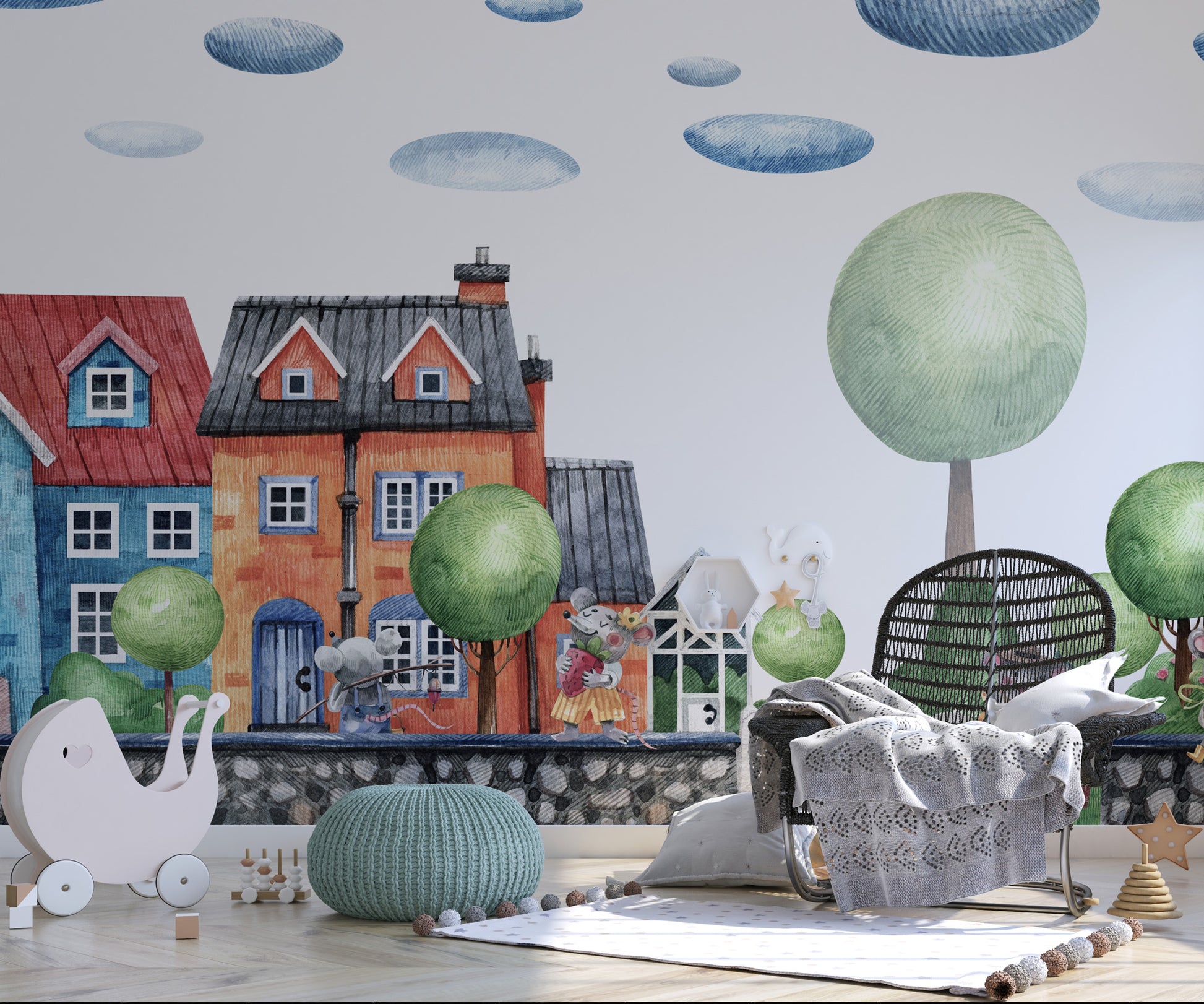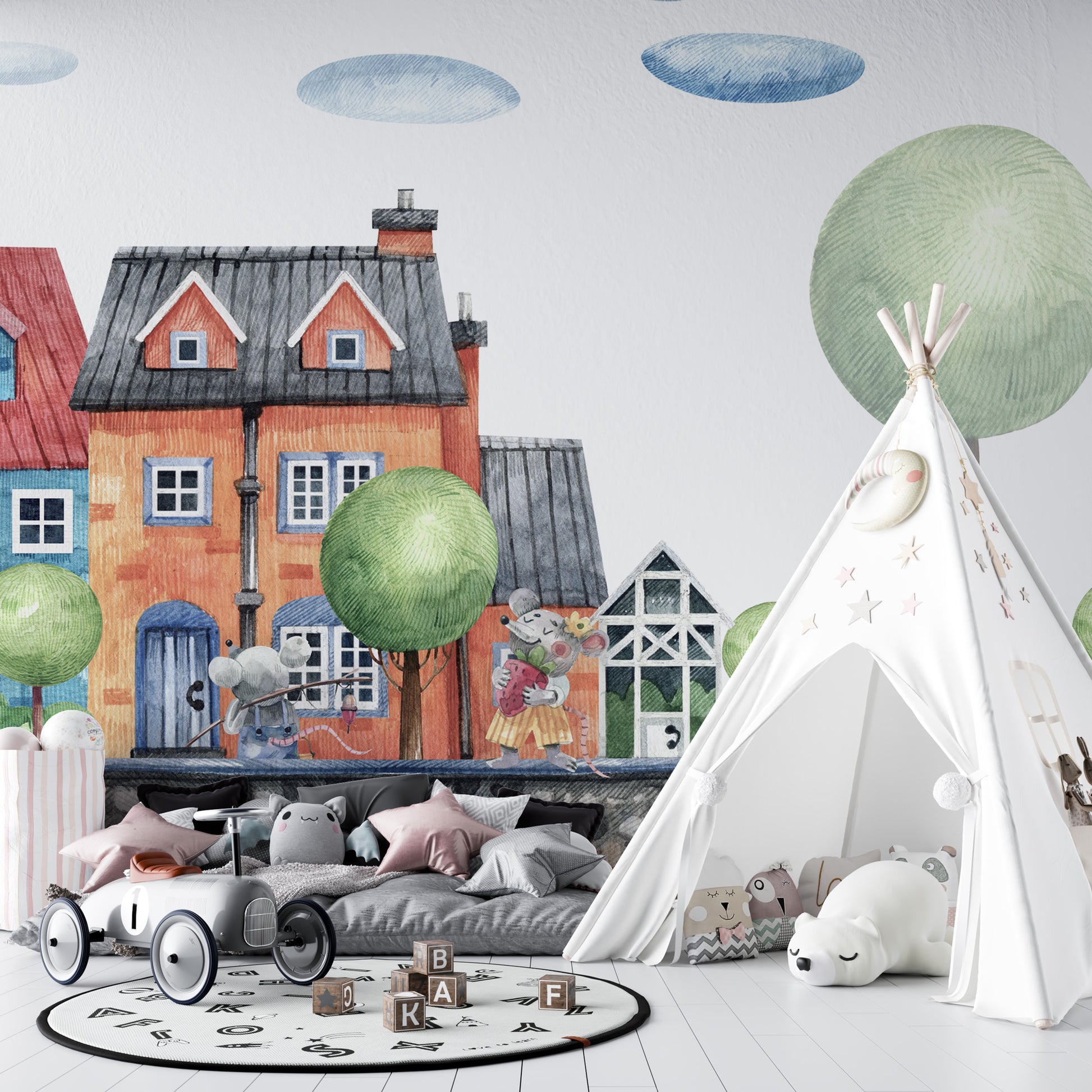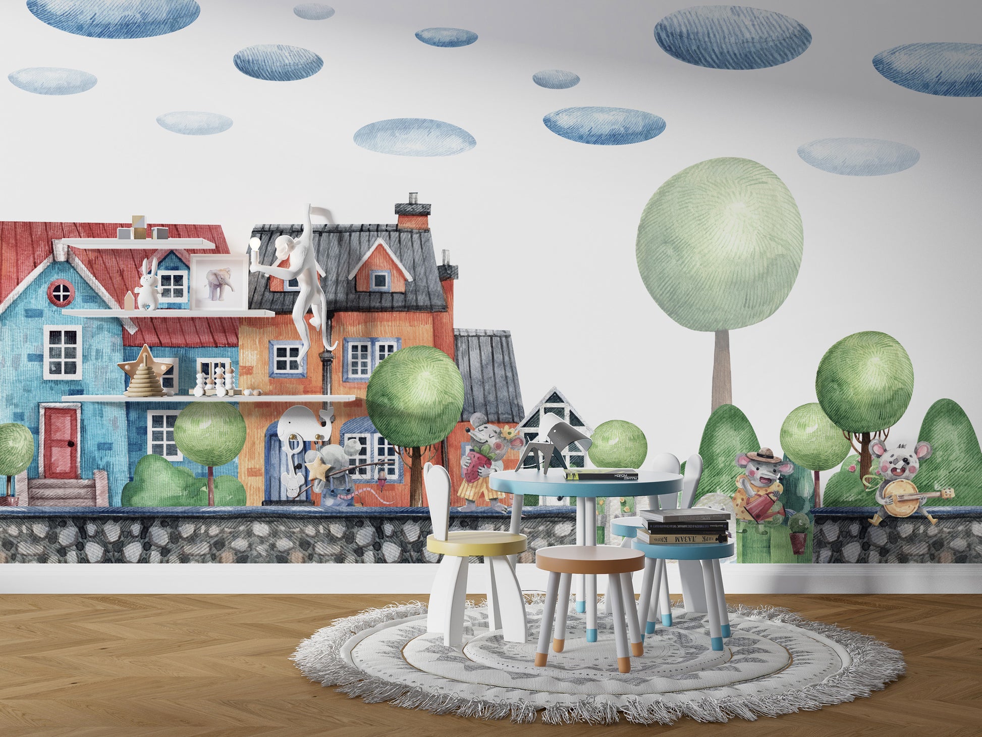 Renkli Bebek Evleri ve Mutlu Hayvanlar Çocuk Duvar Kağıdı üretimi, uygulanmasını isteyeceğiniz boyut ve konumuna uygun olarak talepleriniz doğrultusunda size özel imal edilir.