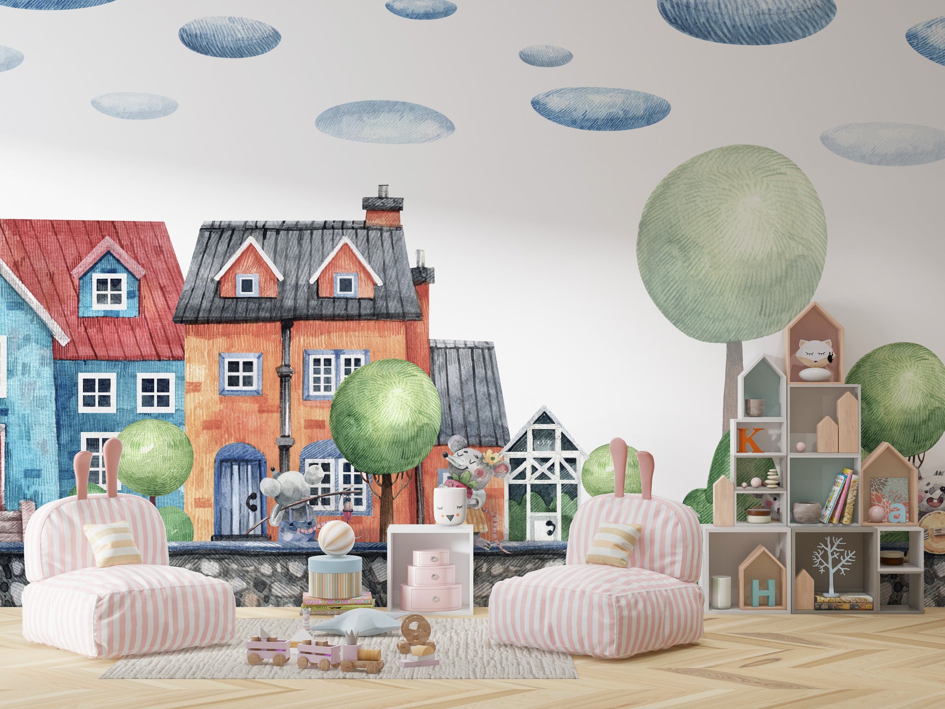 Renkli Bebek Evleri ve Mutlu Hayvanlar Çocuk Duvar Kağıdı Duvar Kağıdı Ürün Bilgisi