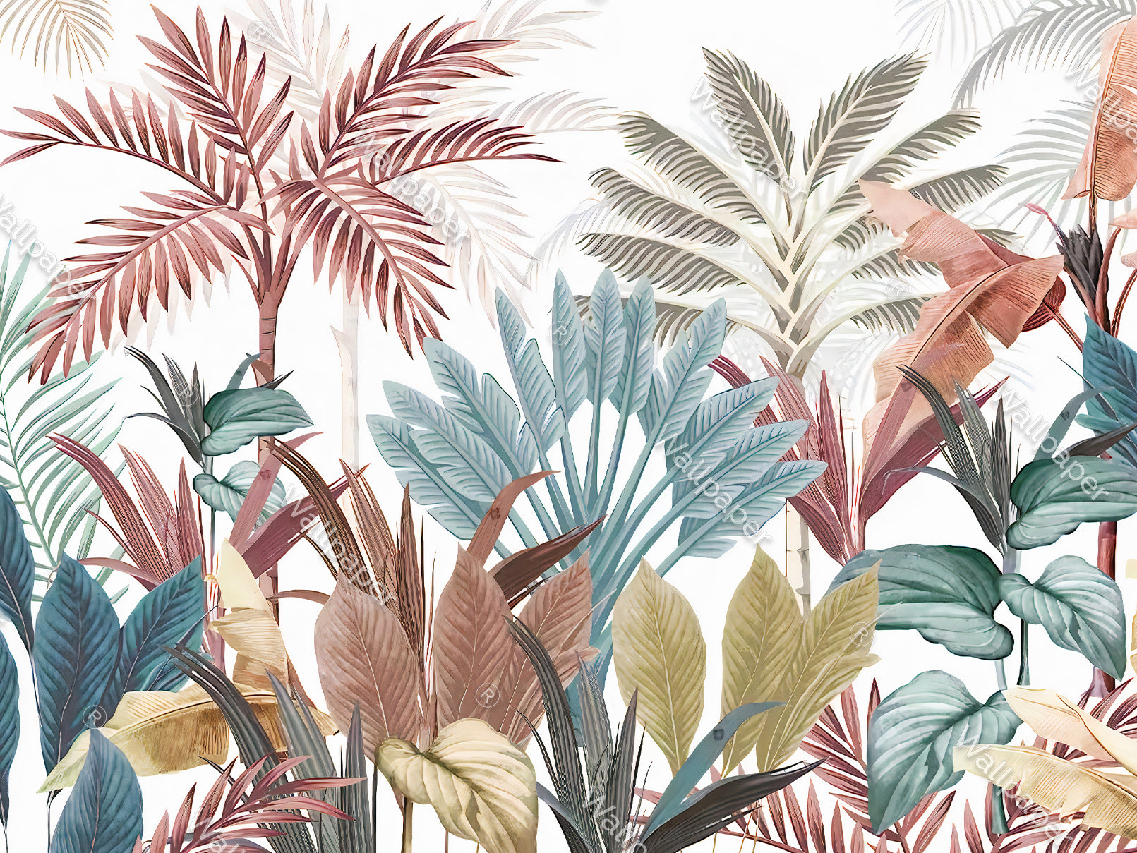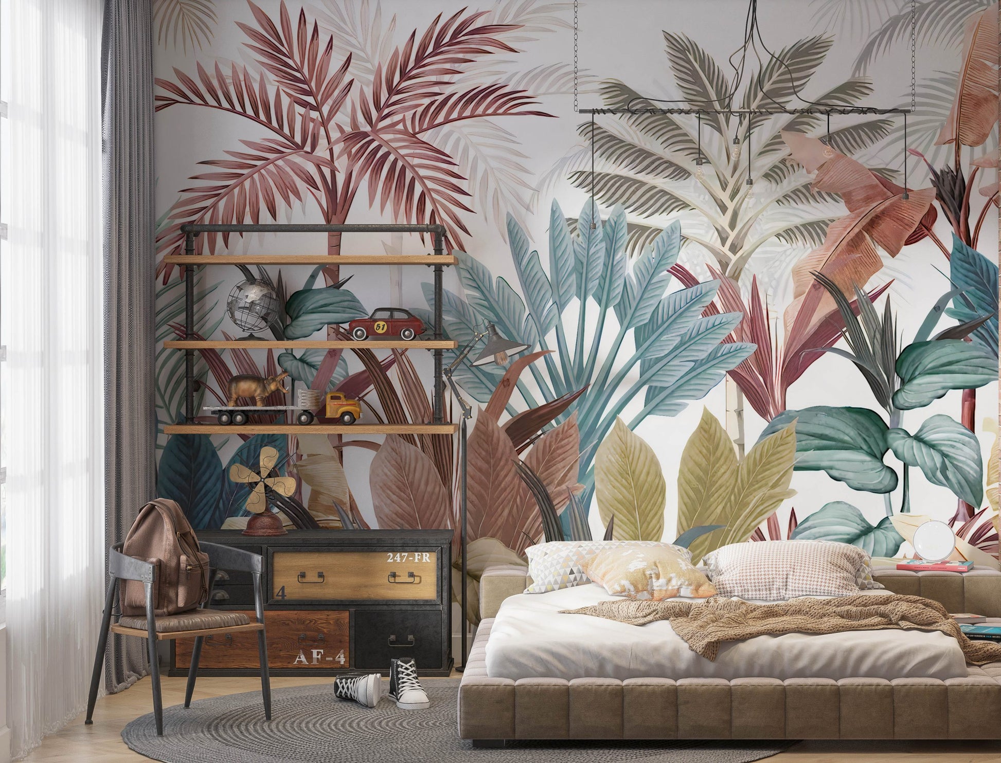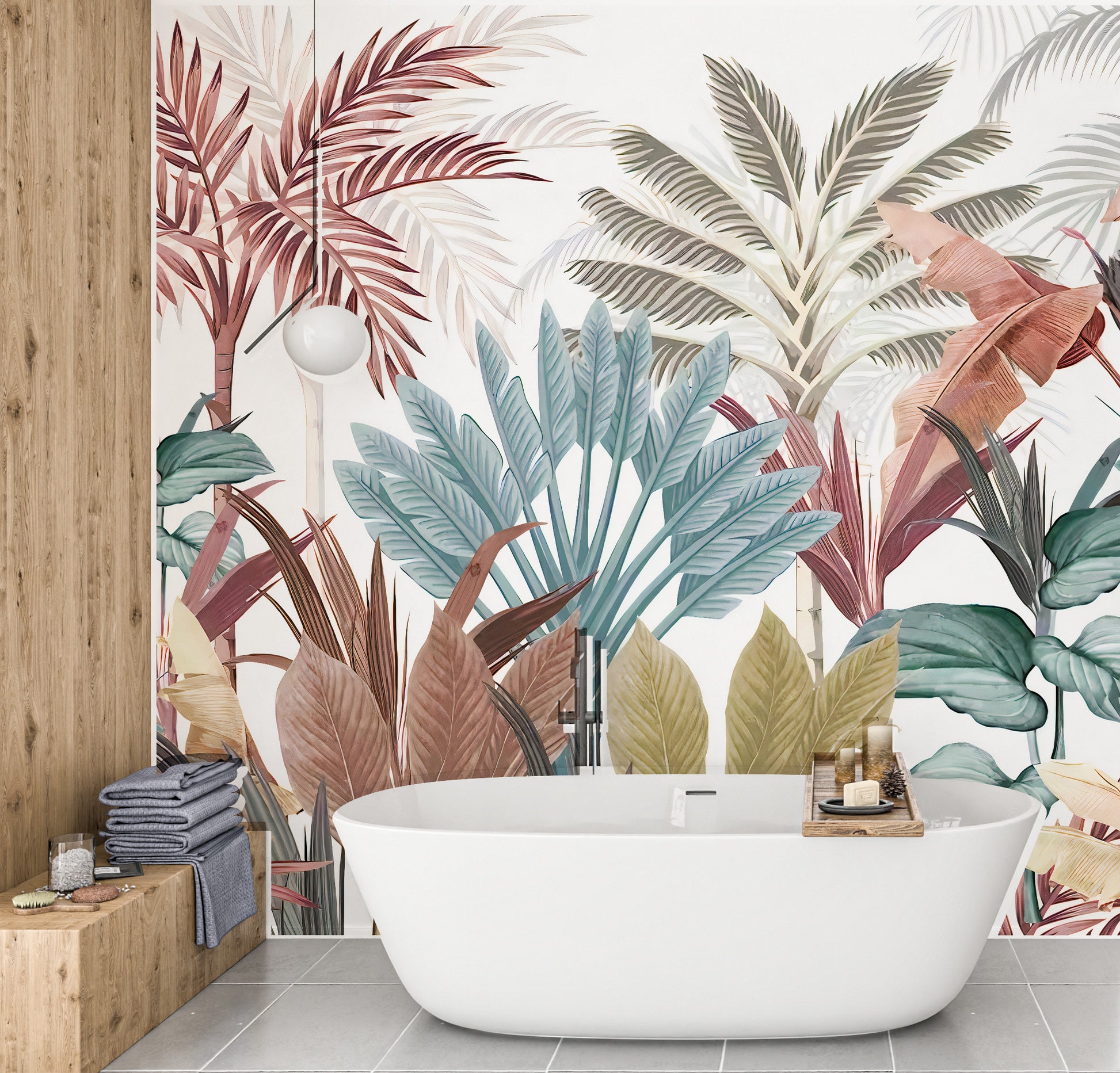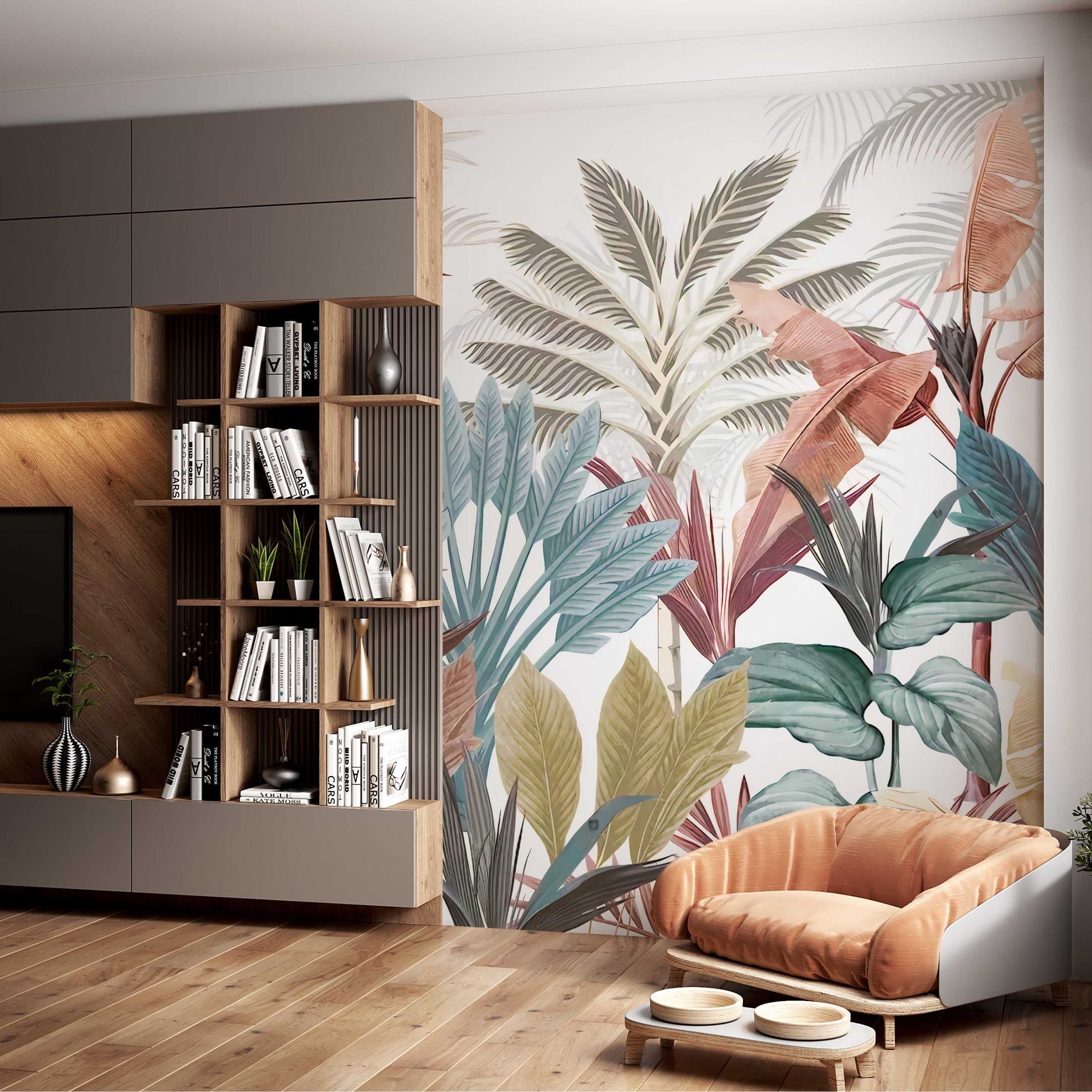 Renkli Tropikal Ağaçlar ve Yapraklar Duvar Kağıdı üretimi, uygulanmasını isteyeceğiniz boyut ve konumuna uygun olarak talepleriniz doğrultusunda size özel imal edilir.