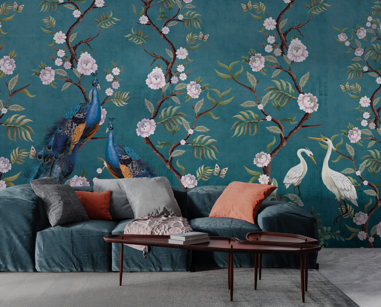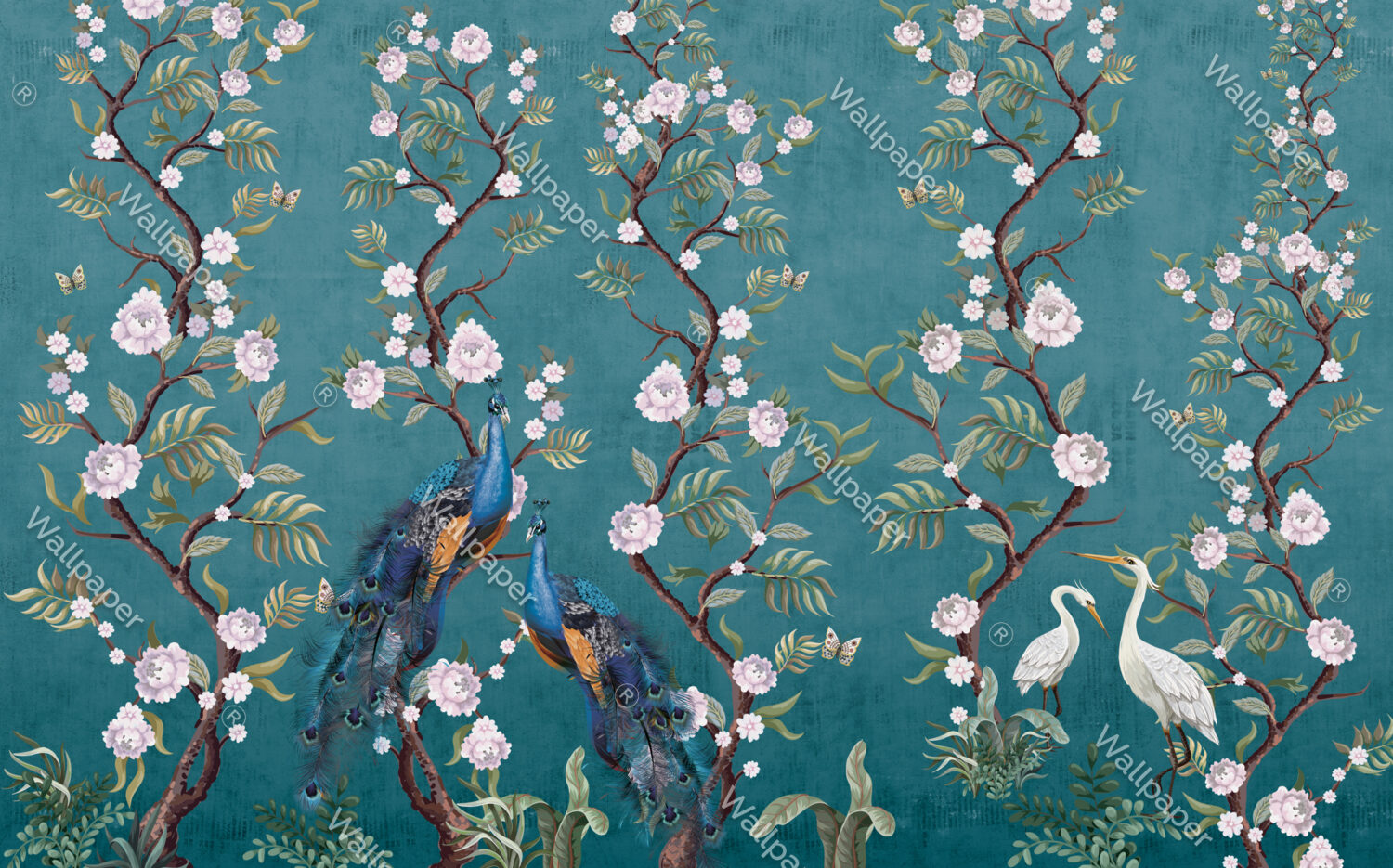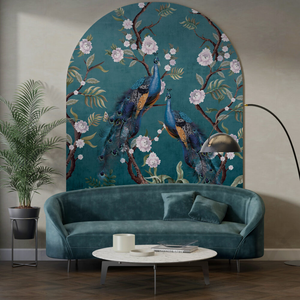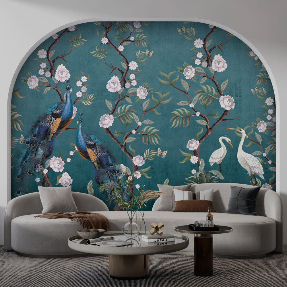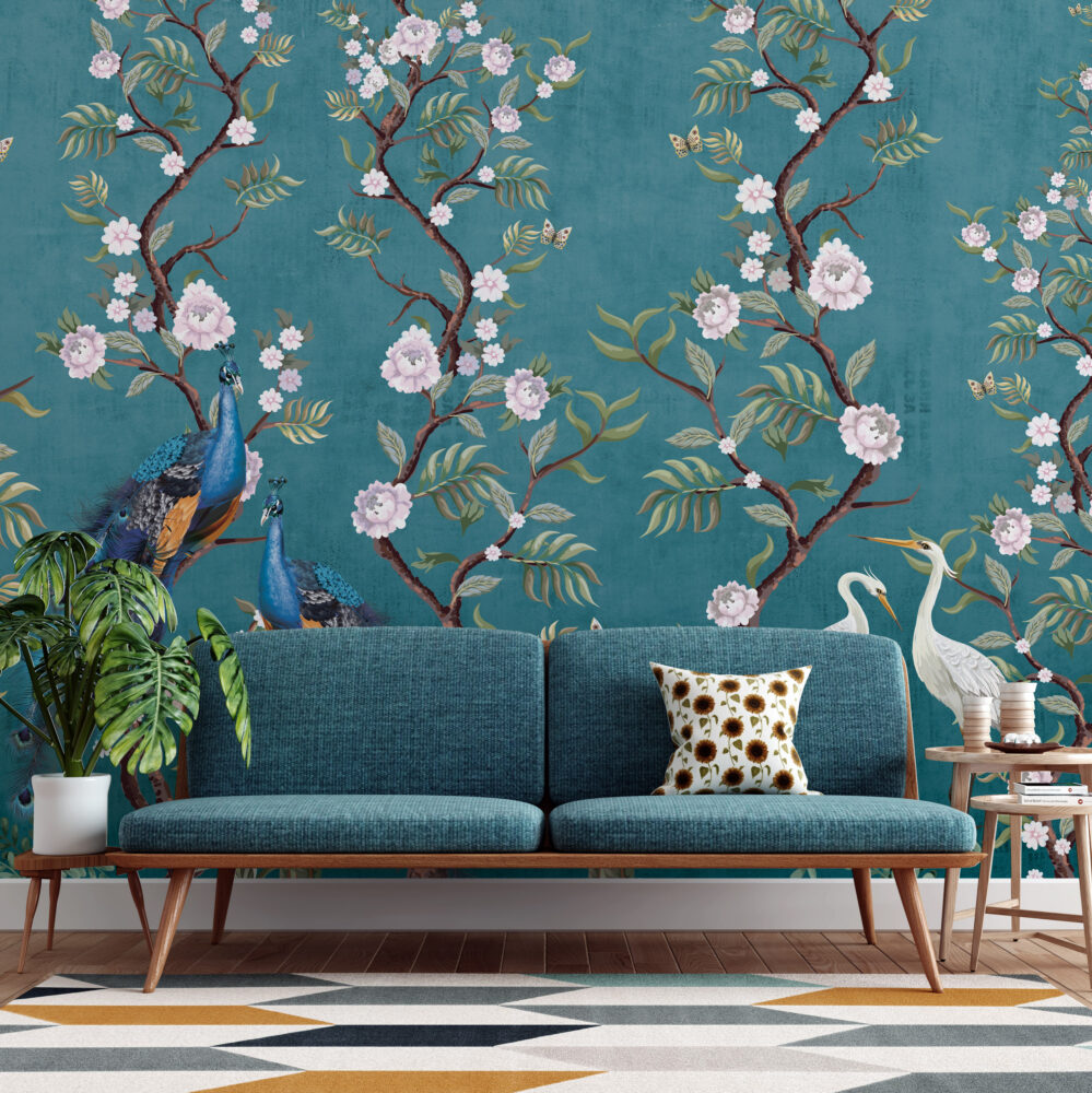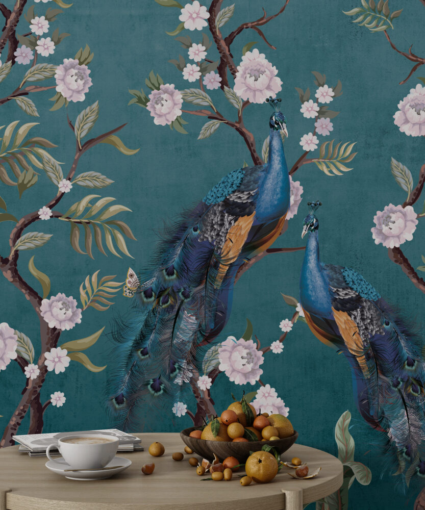 Şakayık Çiçekleri ve Tavus Kuşları -Mavi Duvar Kağıdı üretimi, uygulanmasını isteyeceğiniz boyut ve konumuna uygun olarak talepleriniz doğrultusunda size özel imal edilir.