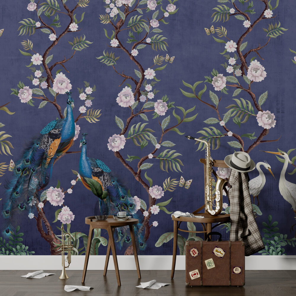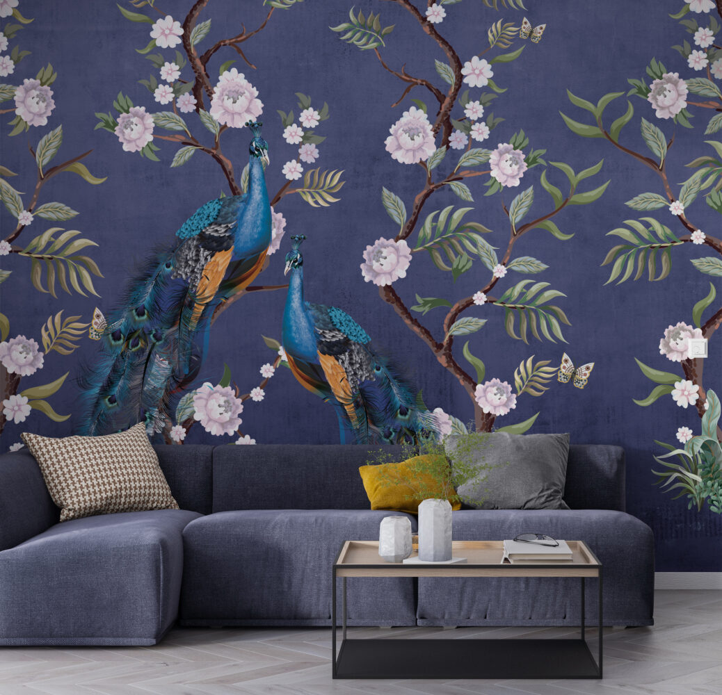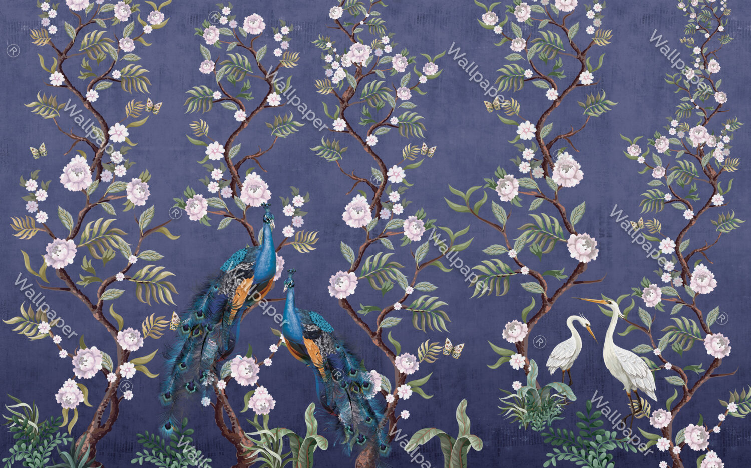 Şakayık Çiçekleri ve Tavus Kuşları -Mor Duvar Kağıdı üretimi, uygulanmasını isteyeceğiniz boyut ve konumuna uygun olarak talepleriniz doğrultusunda size özel imal edilir.