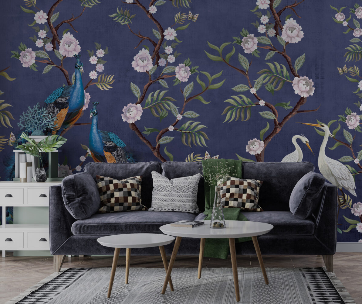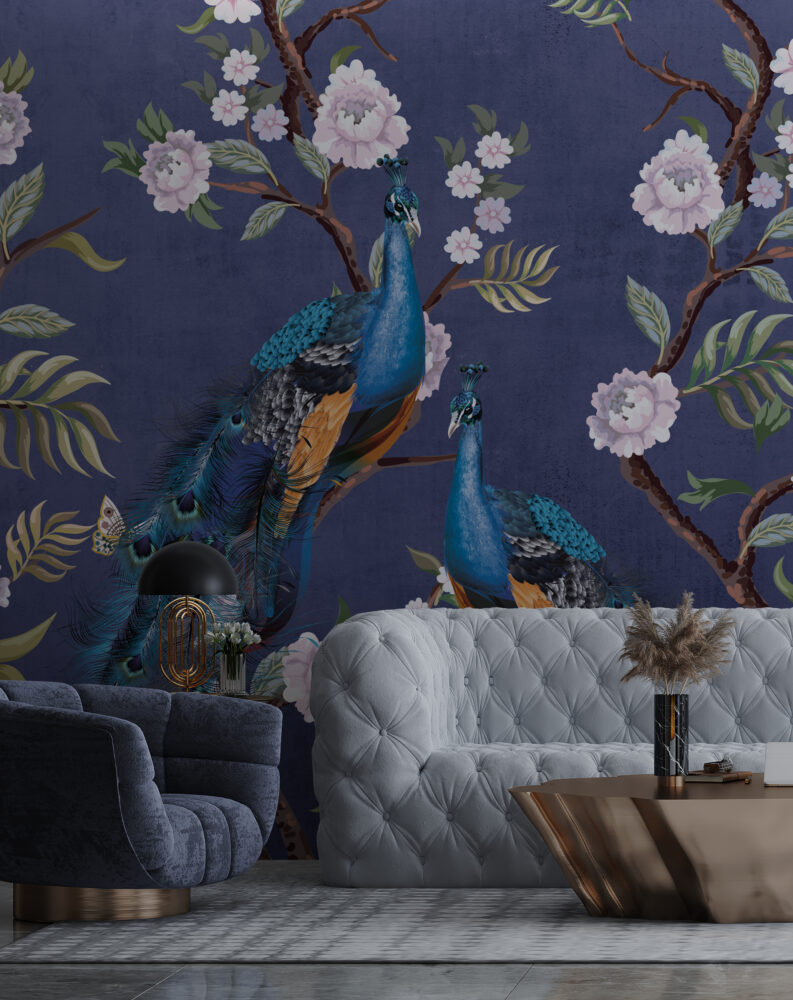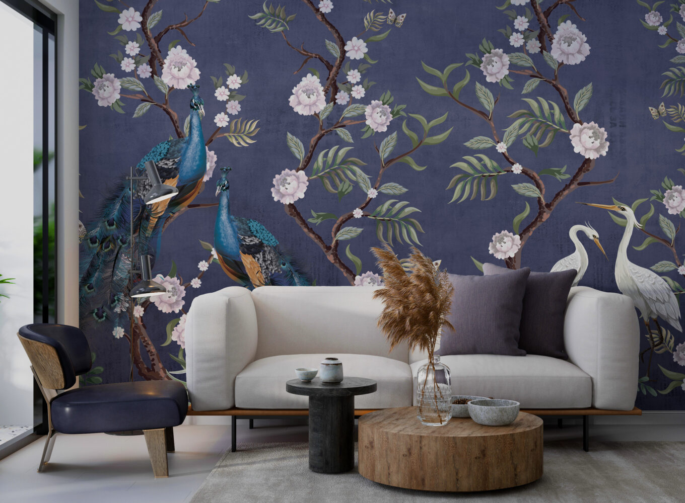 Şakayık Çiçekleri ve Tavus Kuşları -Mor Duvar Kağıdı üretimi, uygulanmasını isteyeceğiniz boyut ve konumuna uygun olarak talepleriniz doğrultusunda size özel imal edilir.