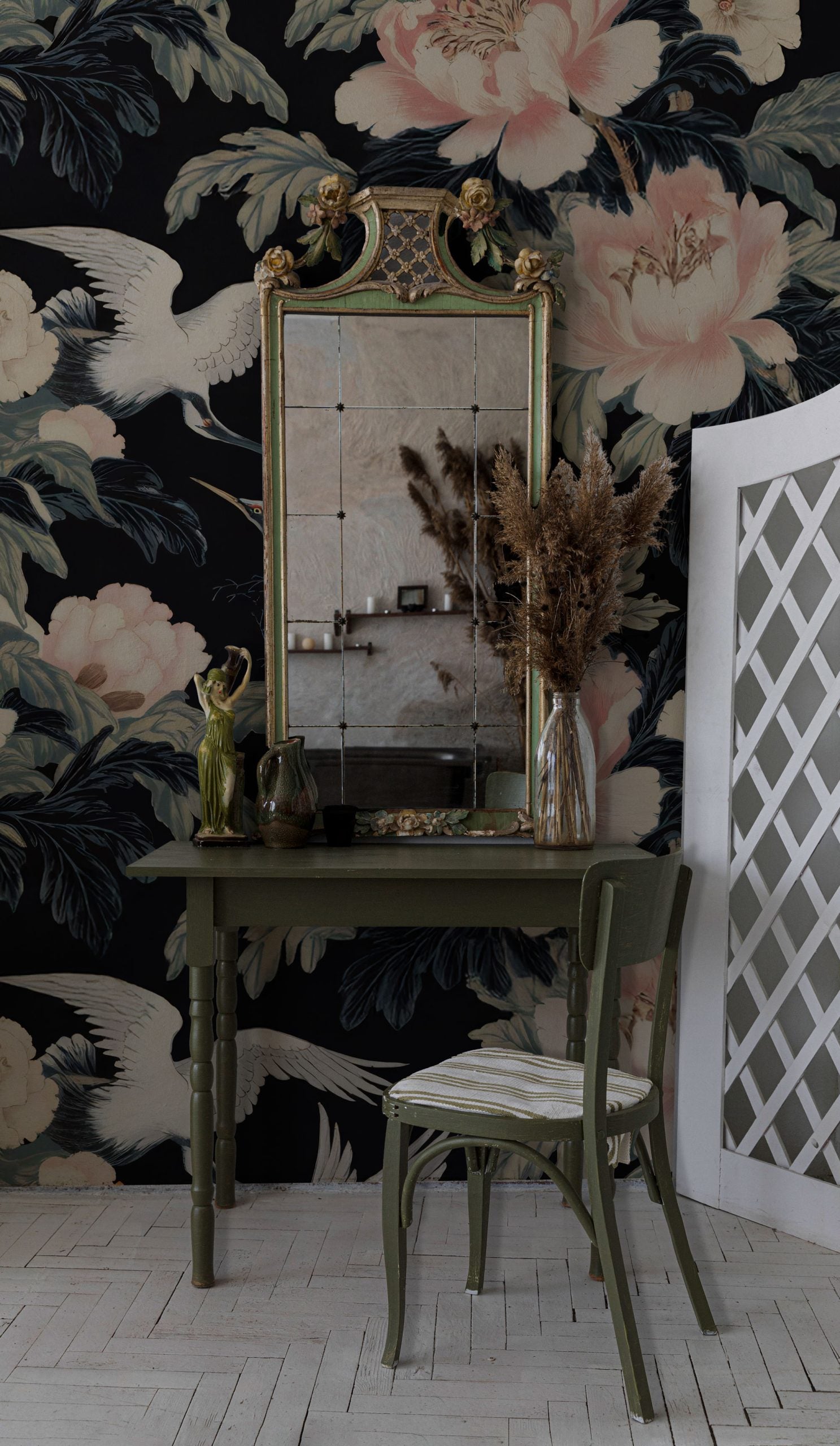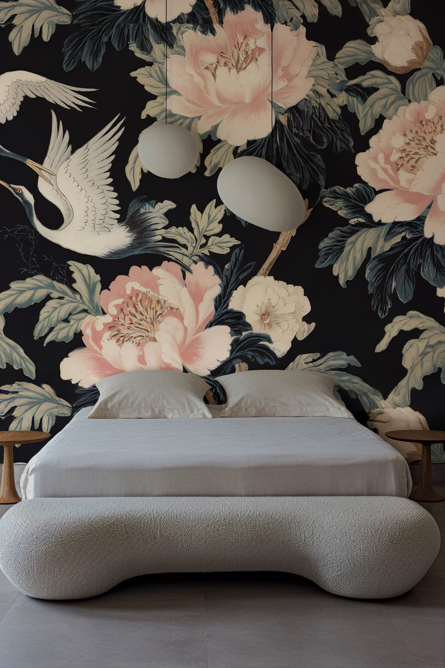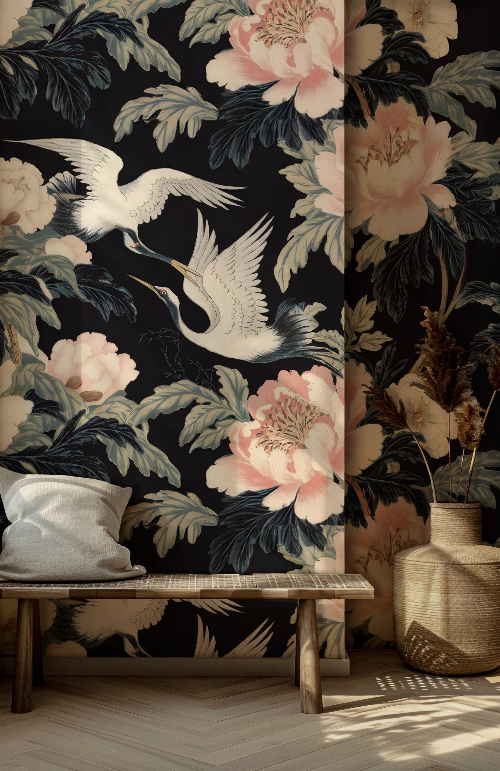 Şakayık Desenli ve Beyaz Turna Kuşlu Duvar Kağıdı üretimi, uygulanmasını isteyeceğiniz boyut ve konumuna uygun olarak talepleriniz doğrultusunda size özel imal edilir.