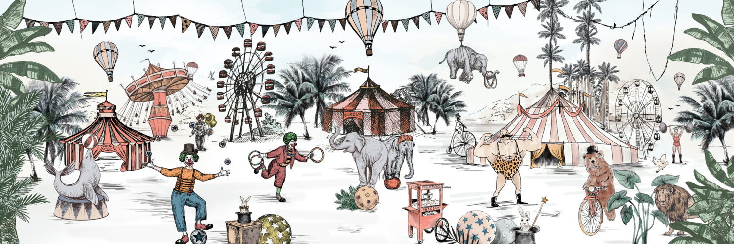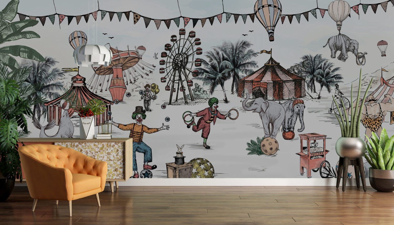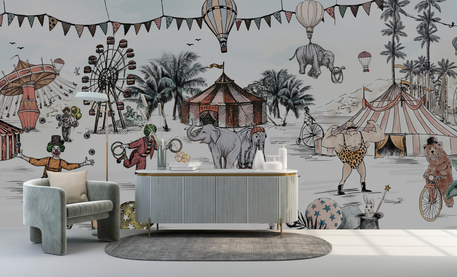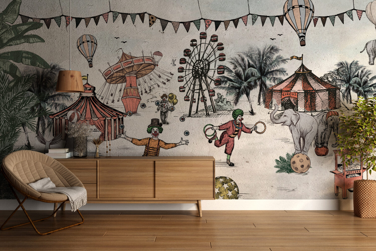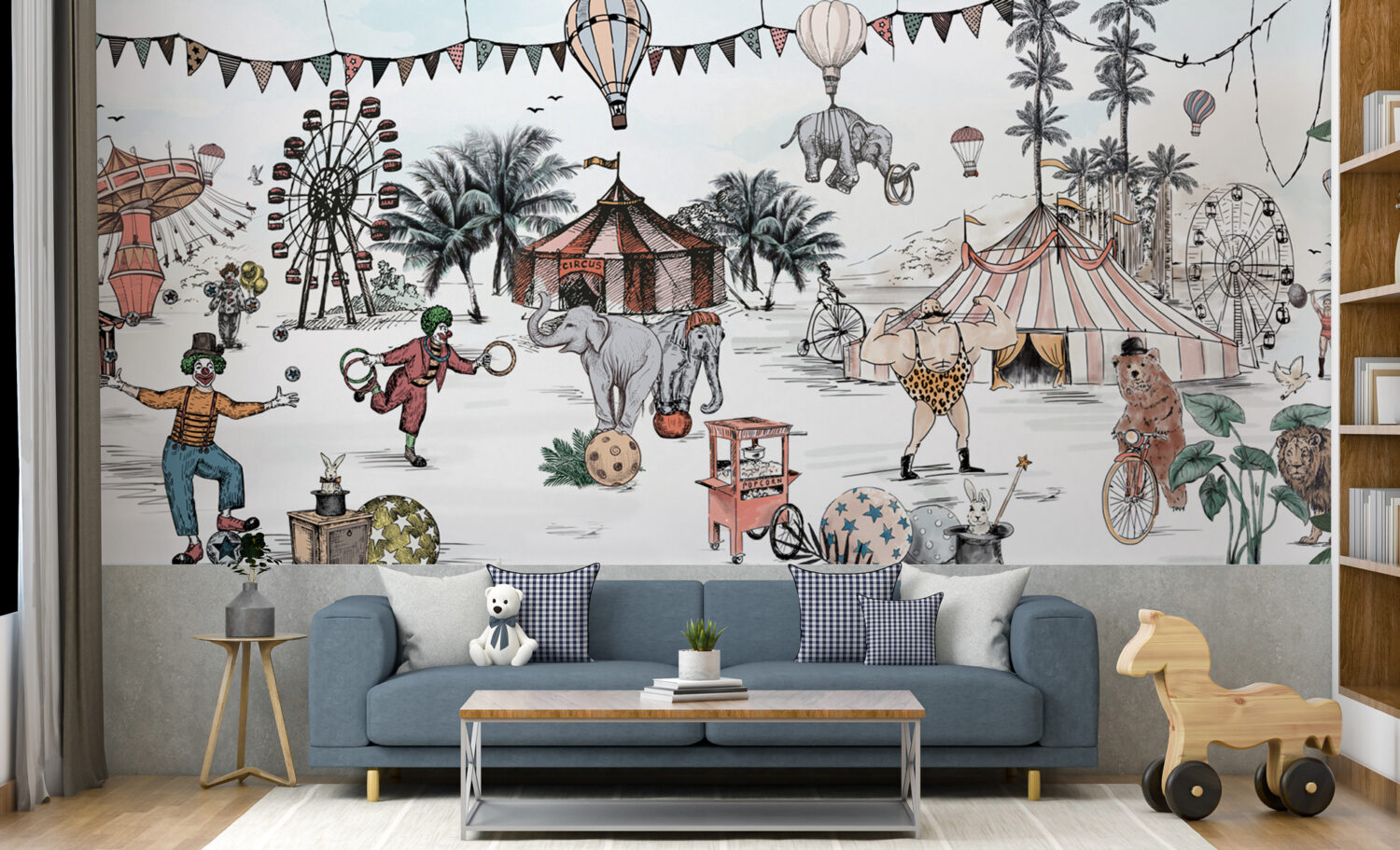 Sirkte ki Palyaço Ve Hayvanlar Çocuk Duvar Kağıdı üretimi, uygulanmasını isteyeceğiniz boyut ve konumuna uygun olarak talepleriniz doğrultusunda size özel imal edilir.