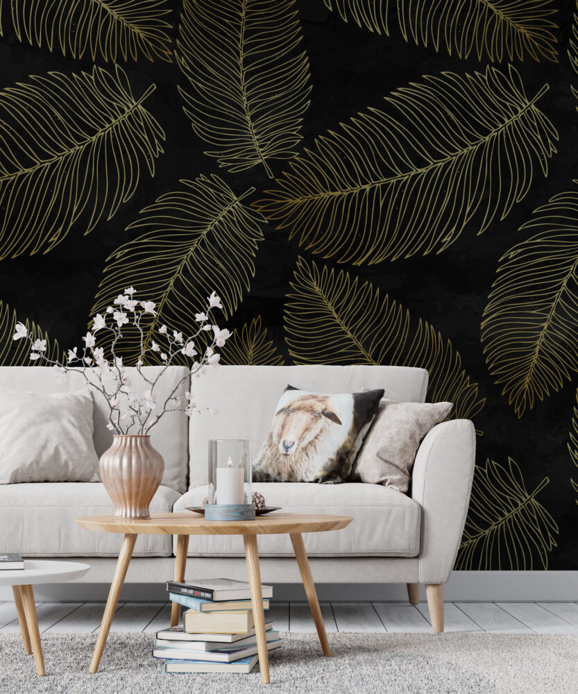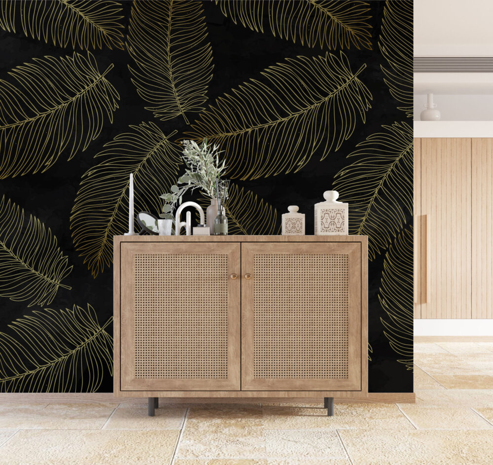 Siyah Arkaplanlı Tropikal Yapraklar Duvar Kağıdı üretimi, uygulanmasını isteyeceğiniz boyut ve konumuna uygun olarak talepleriniz doğrultusunda size özel imal edilir.