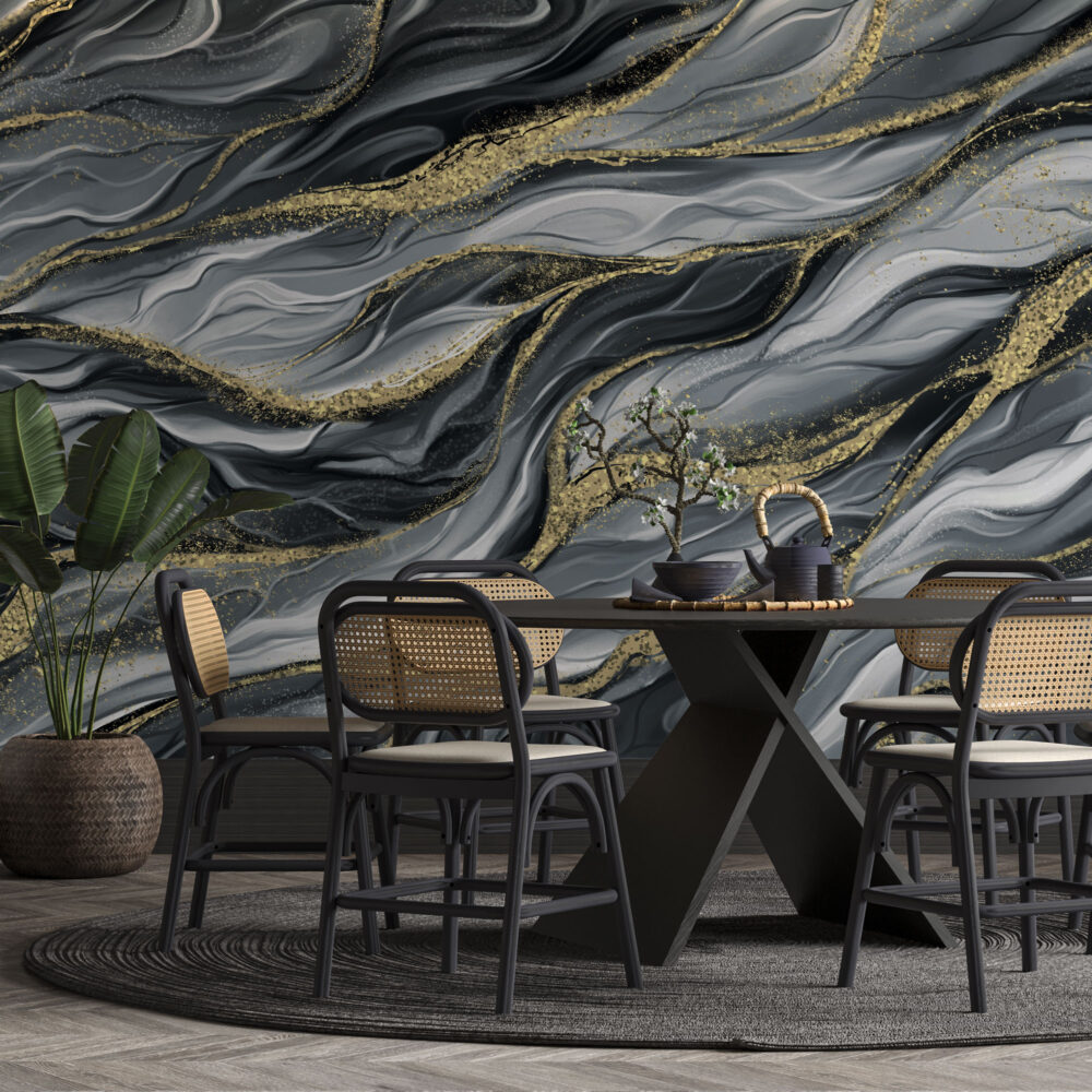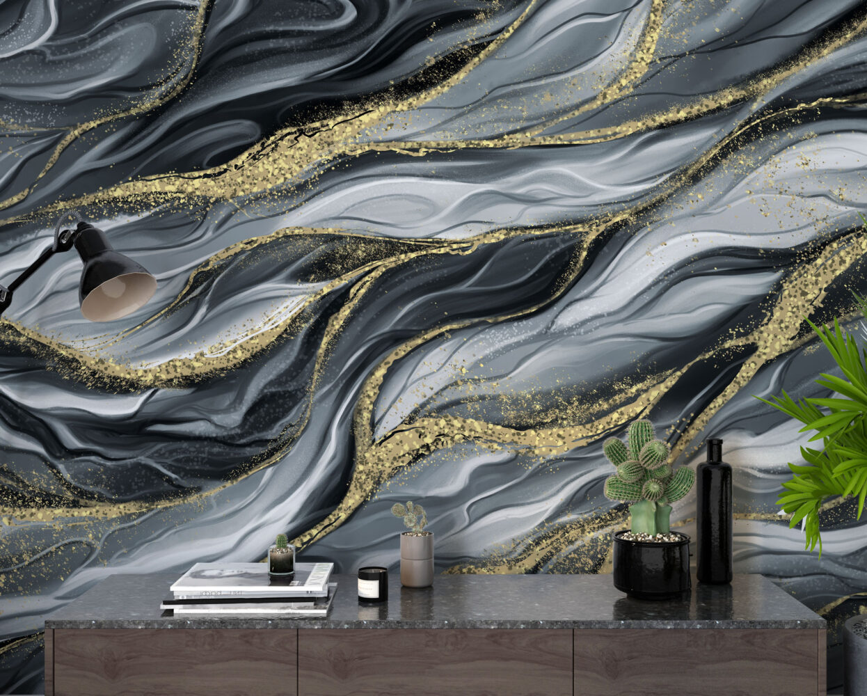 Siyah Beyaz Gold Kenarlı Dalgalar Duvar Kağıdı