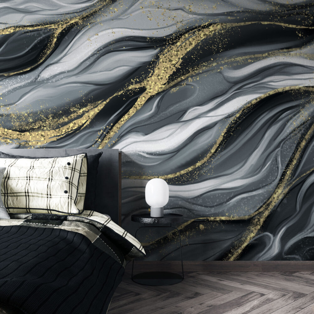 Siyah Beyaz Gold Kenarlı Dalgalar Duvar Kağıdı üretimi, uygulanmasını isteyeceğiniz boyut ve konumuna uygun olarak talepleriniz doğrultusunda size özel imal edilir.