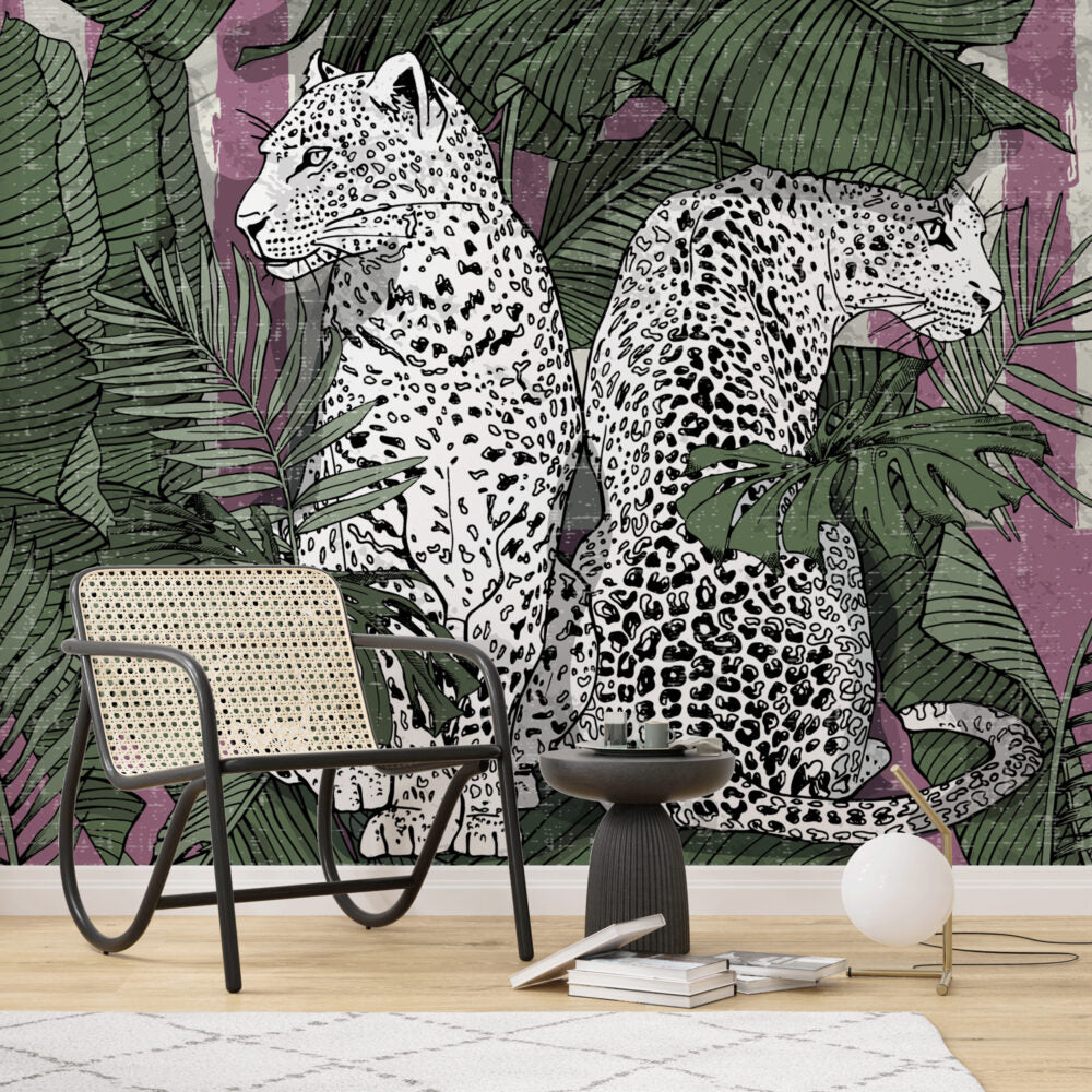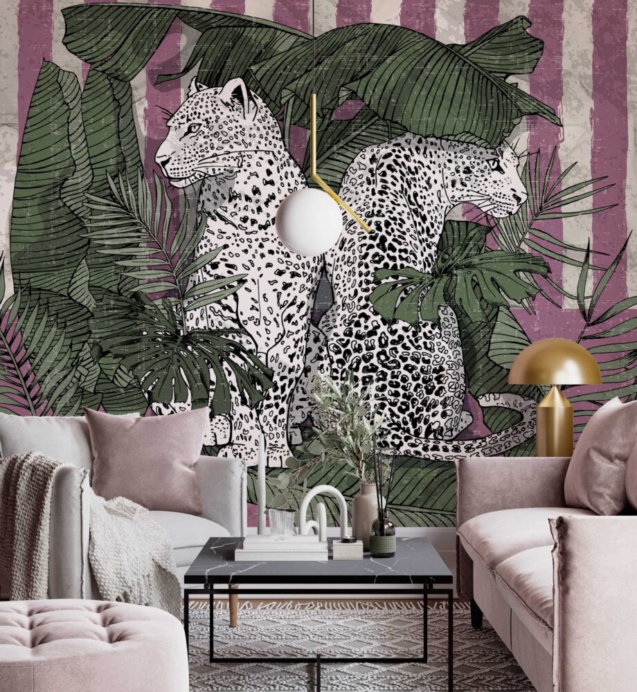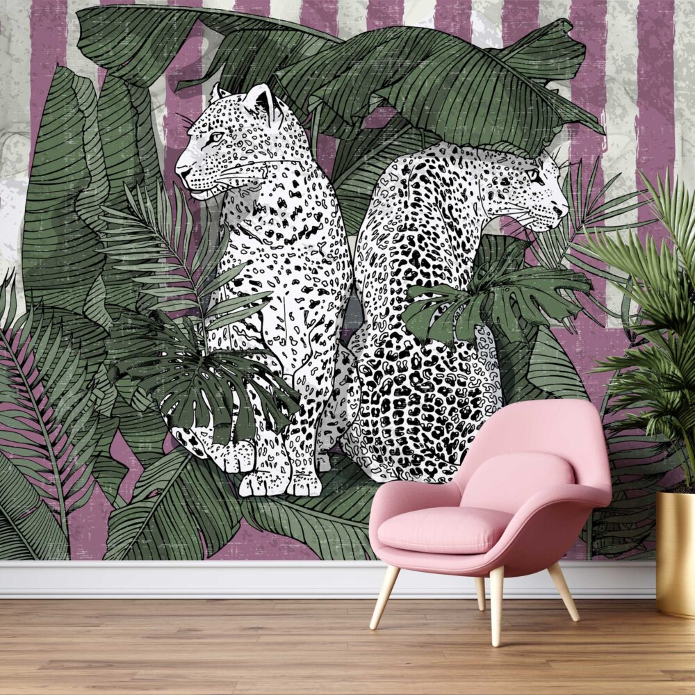 Siyah Beyaz Leopar Figürlü Pembe Tropikal Duvar Kağıdı üretimi, uygulanmasını isteyeceğiniz boyut ve konumuna uygun olarak talepleriniz doğrultusunda size özel imal edilir.