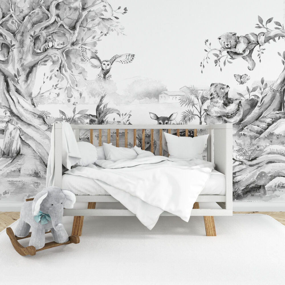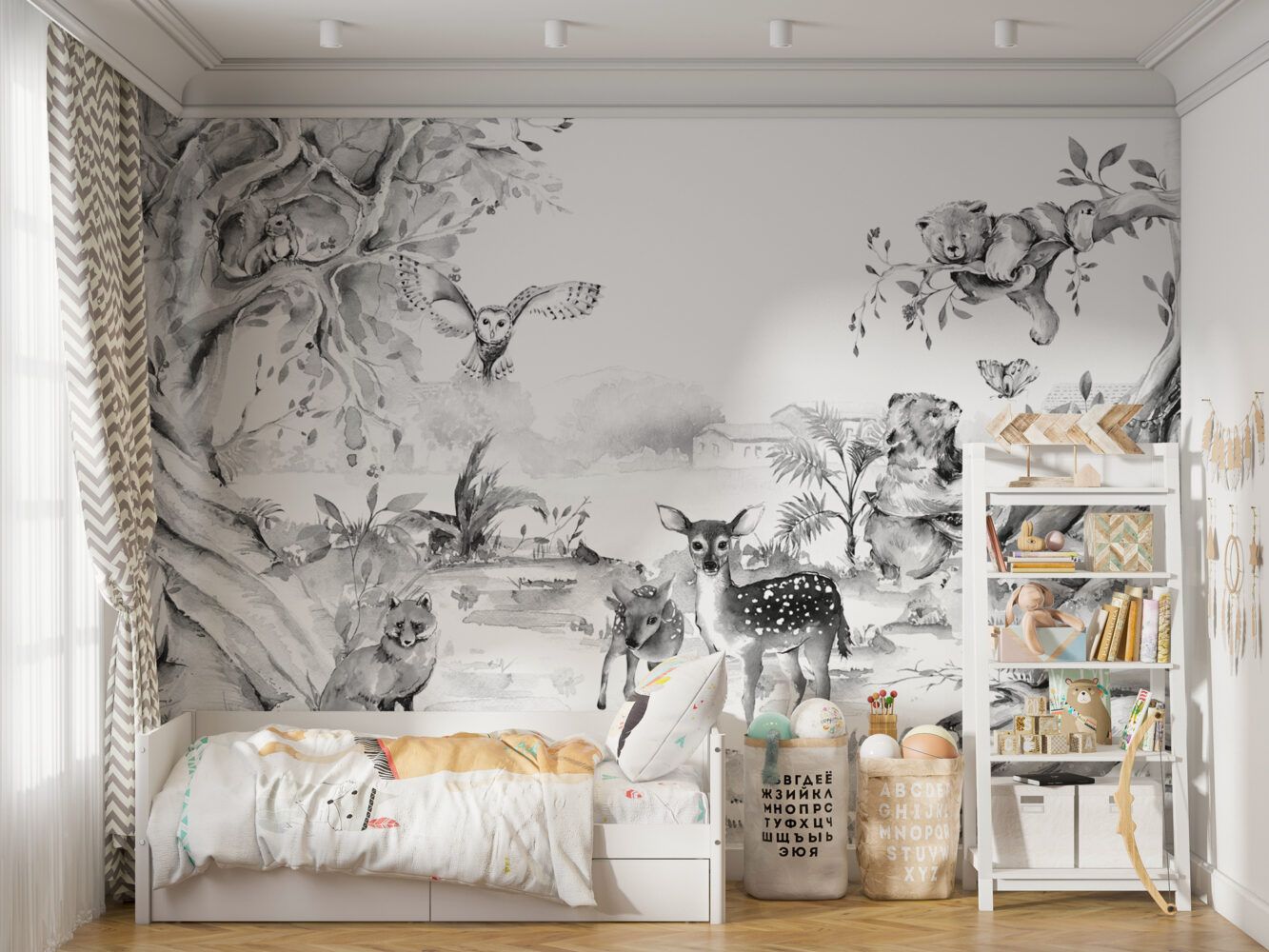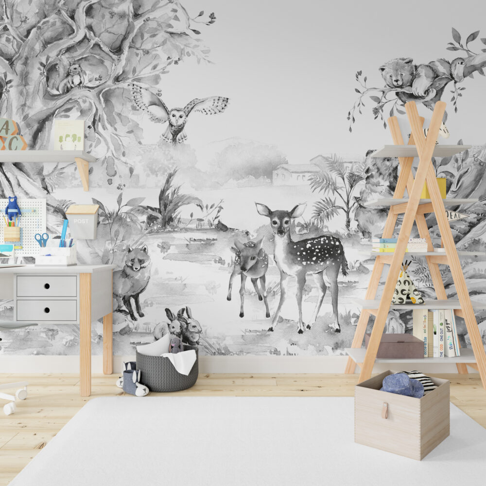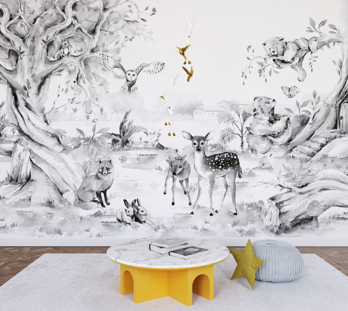 Siyah Beyaz Ormandaki Şirin Geyik Ve Hayvanlar Duvar Kağıdı üretimi, uygulanmasını isteyeceğiniz boyut ve konumuna uygun olarak talepleriniz doğrultusunda size özel imal edilir.