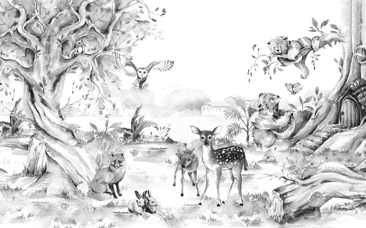 Siyah Beyaz Ormandaki Şirin Geyik Ve Hayvanlar Duvar Kağıdı Duvar Kağıdı Ürün Bilgisi