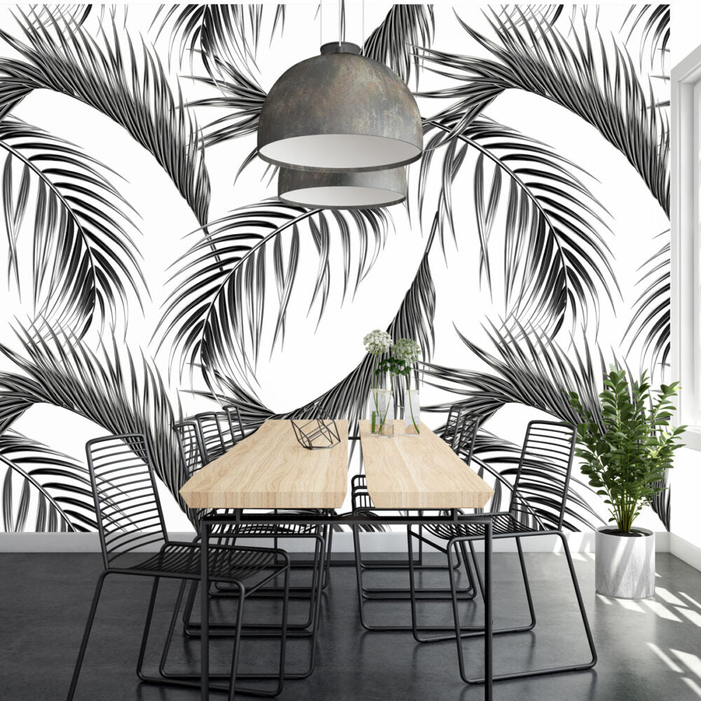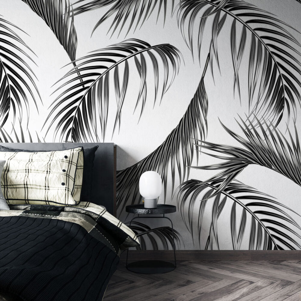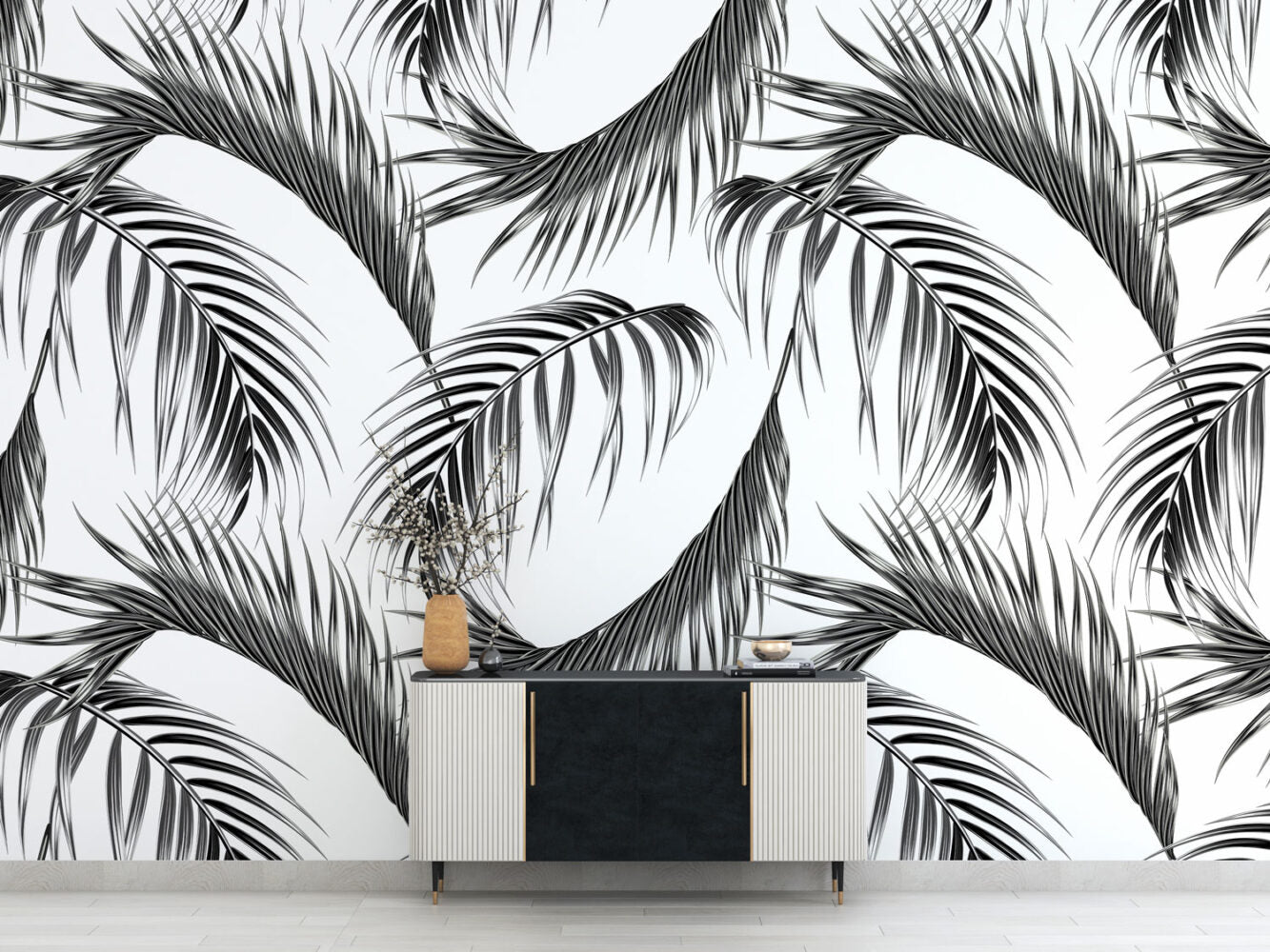 Siyah Beyaz Palmiye Yaprakları Duvar Kağıdı üretimi, uygulanmasını isteyeceğiniz boyut ve konumuna uygun olarak talepleriniz doğrultusunda size özel imal edilir.