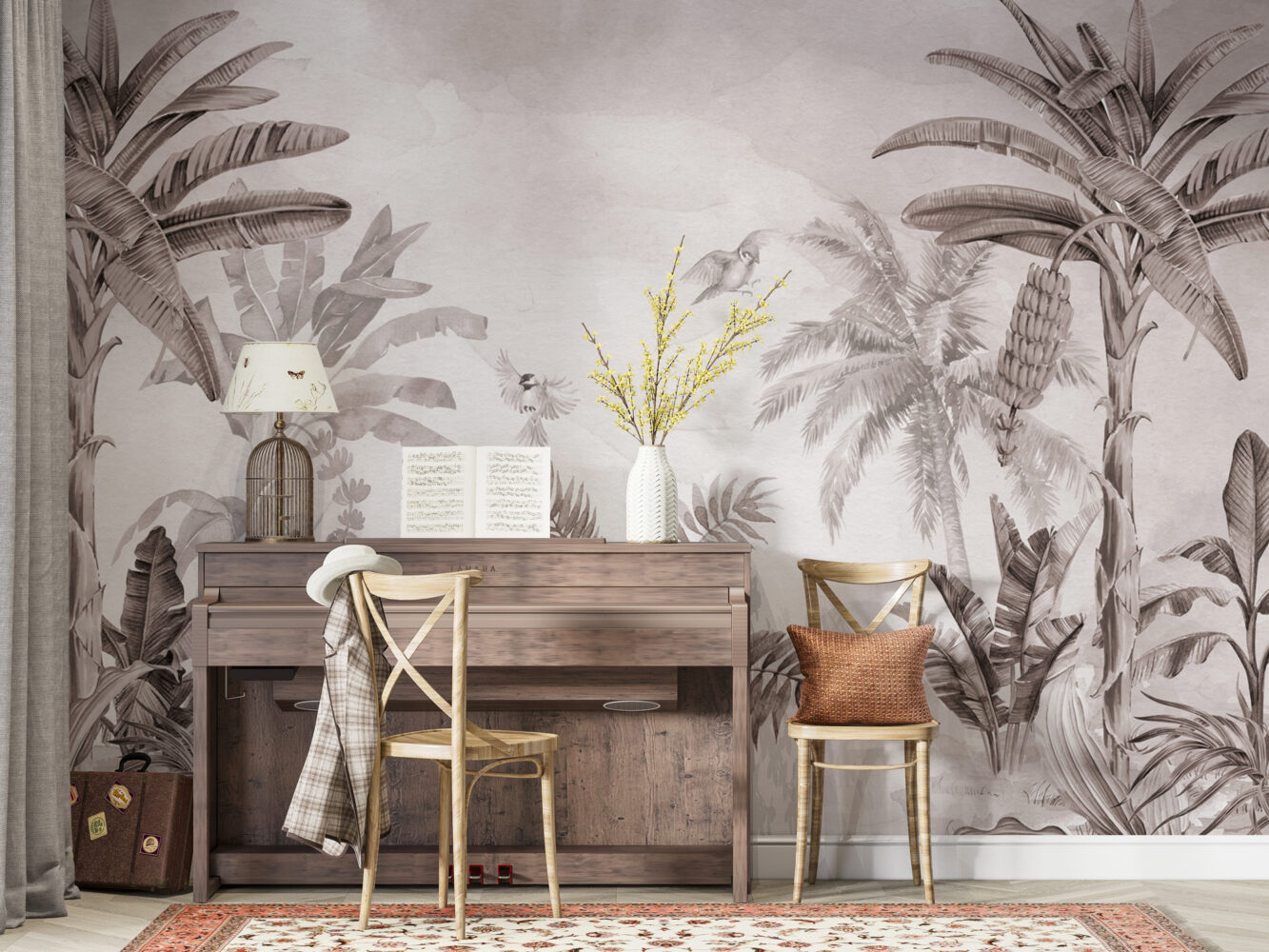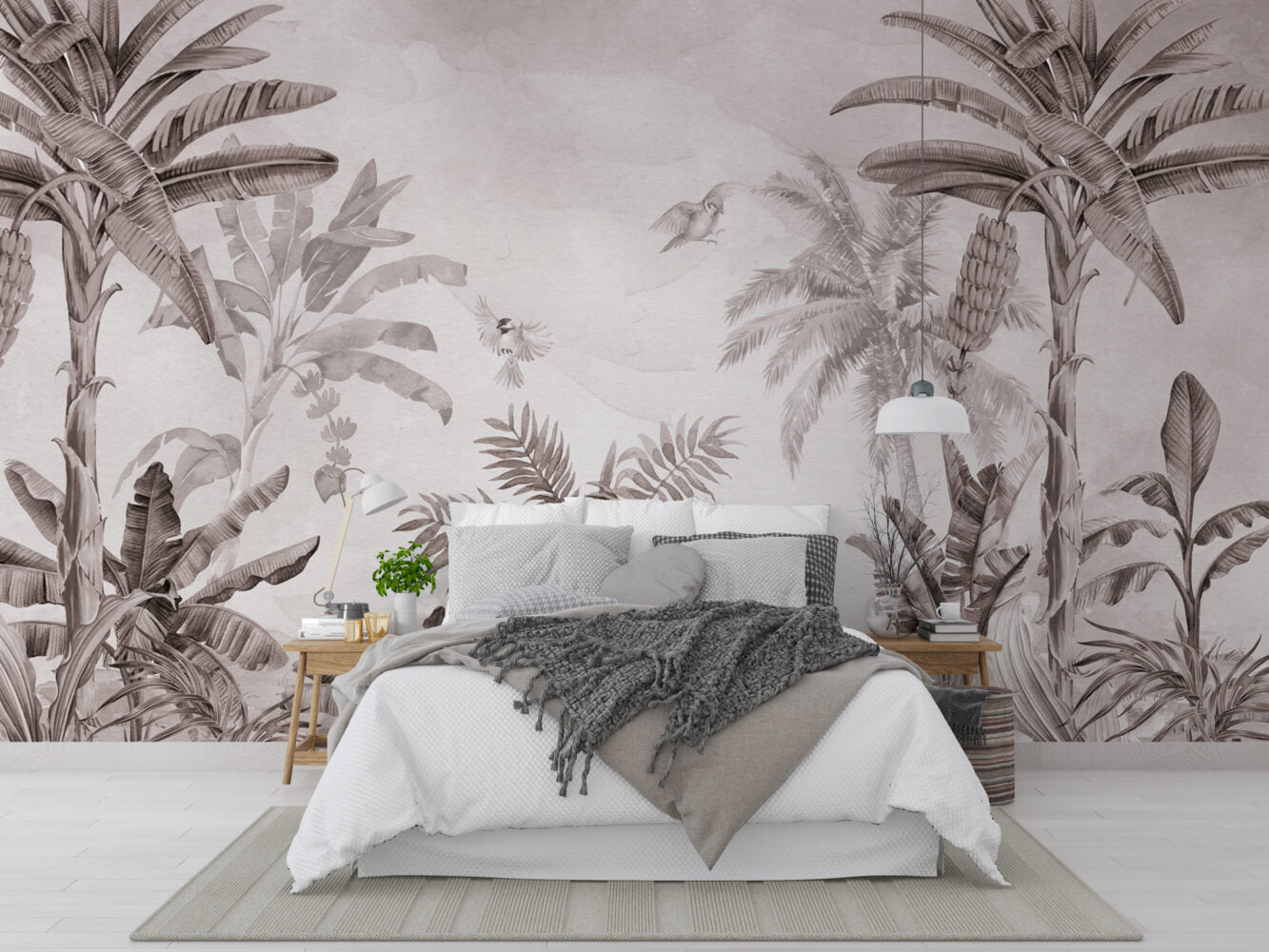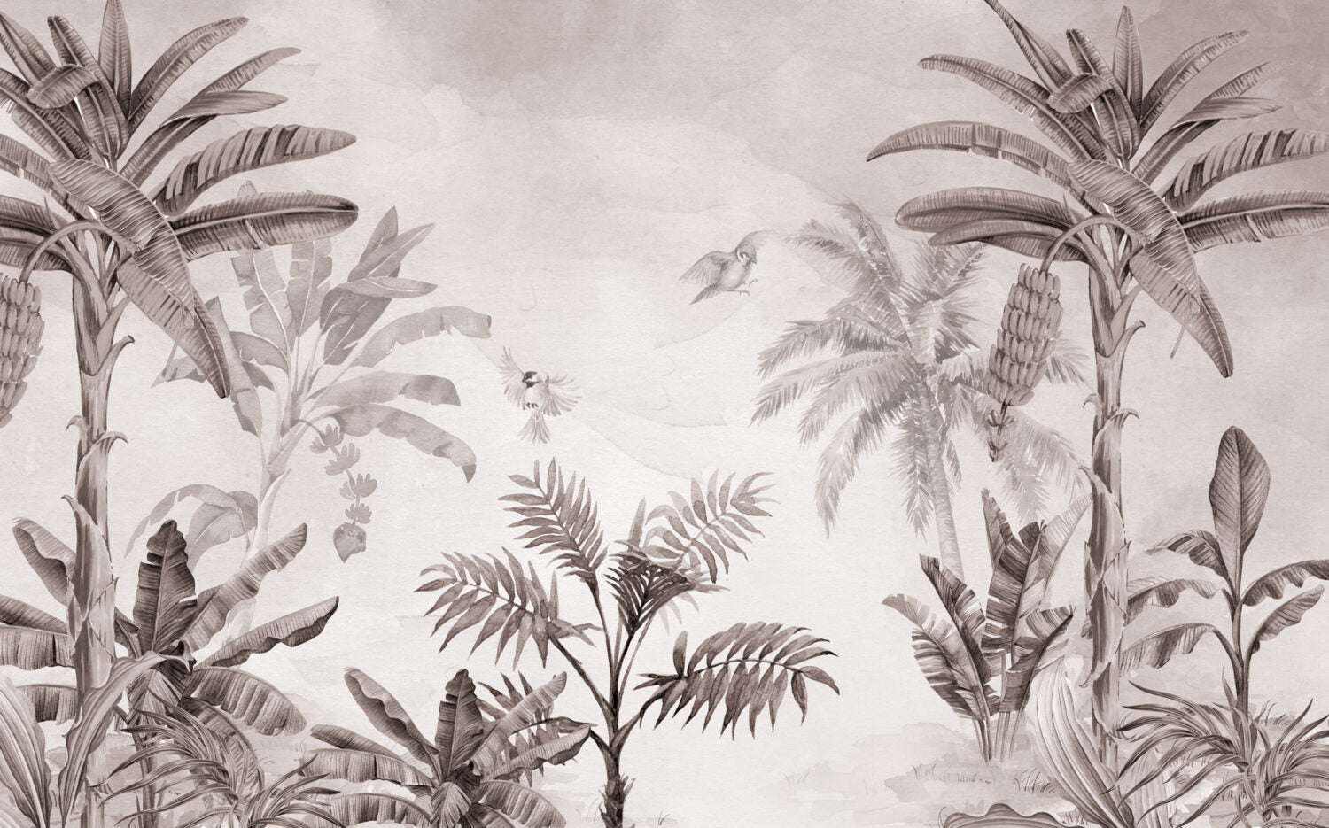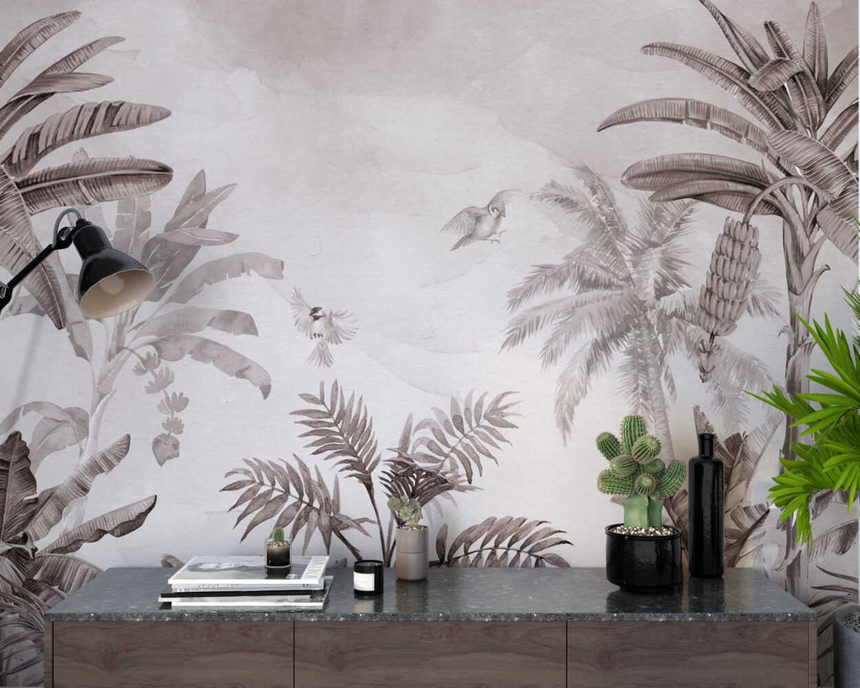 Siyah Beyaz Tropikal Ağaç Desenli Duvar Kağıdı