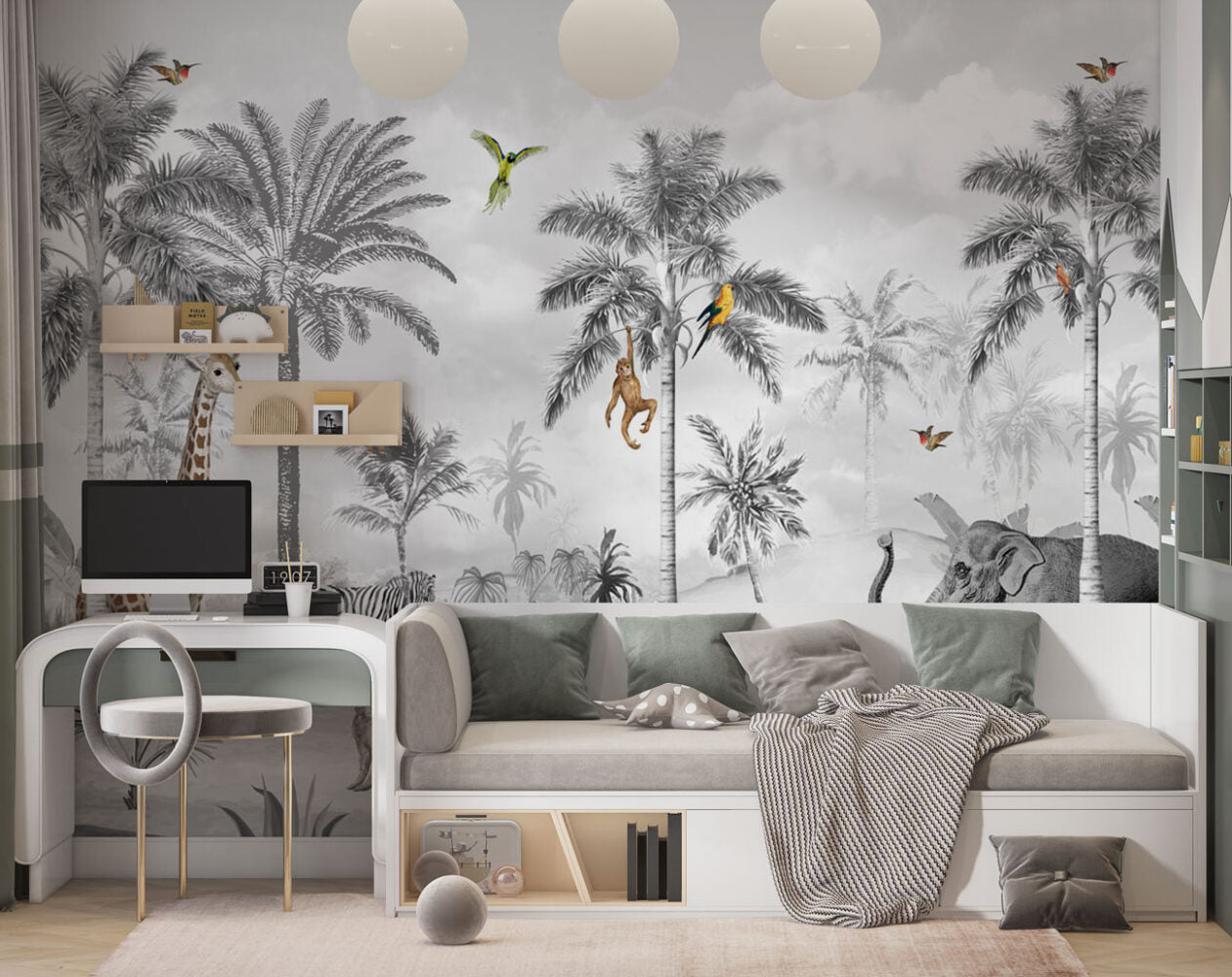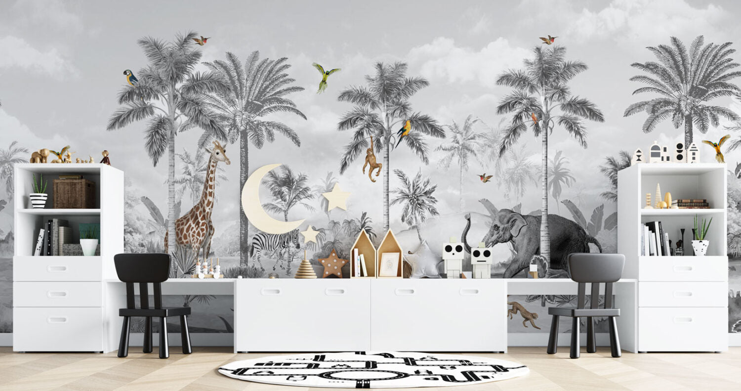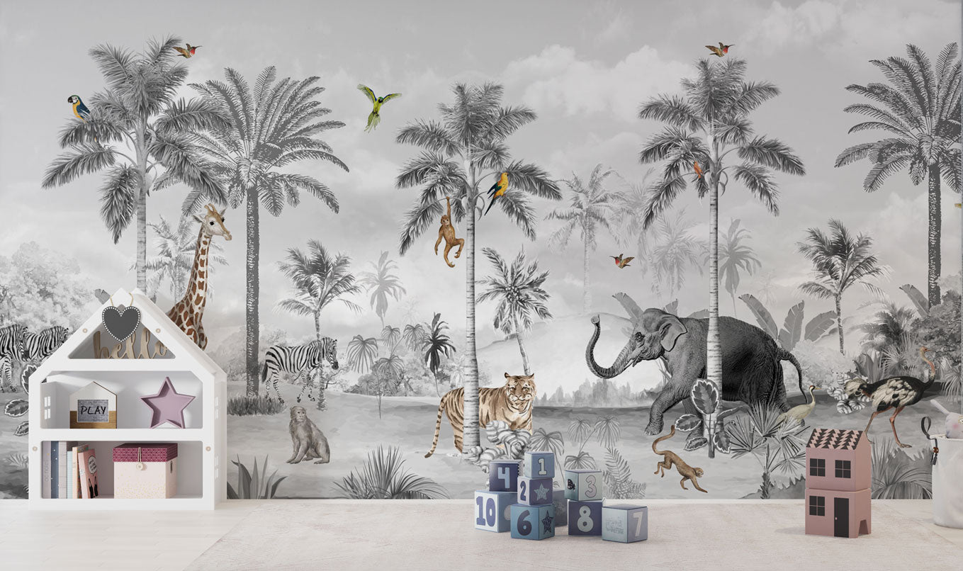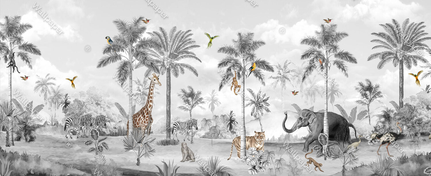 Siyah Beyaz Tropikal Ormandaki Hayvanlar Duvar Kağıdı üretimi, uygulanmasını isteyeceğiniz boyut ve konumuna uygun olarak talepleriniz doğrultusunda size özel imal edilir.