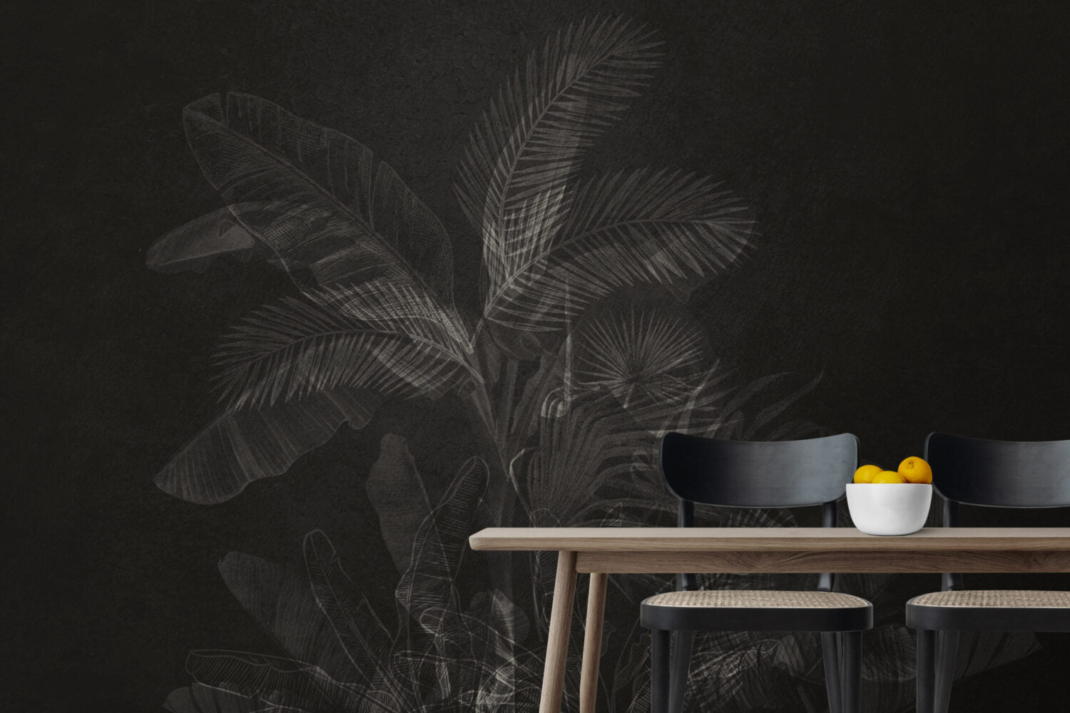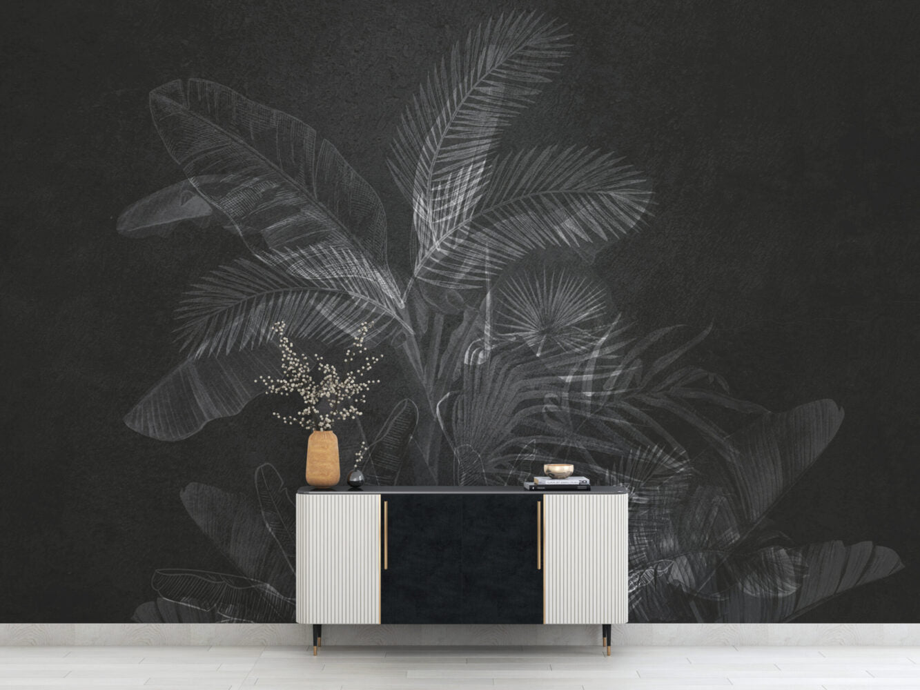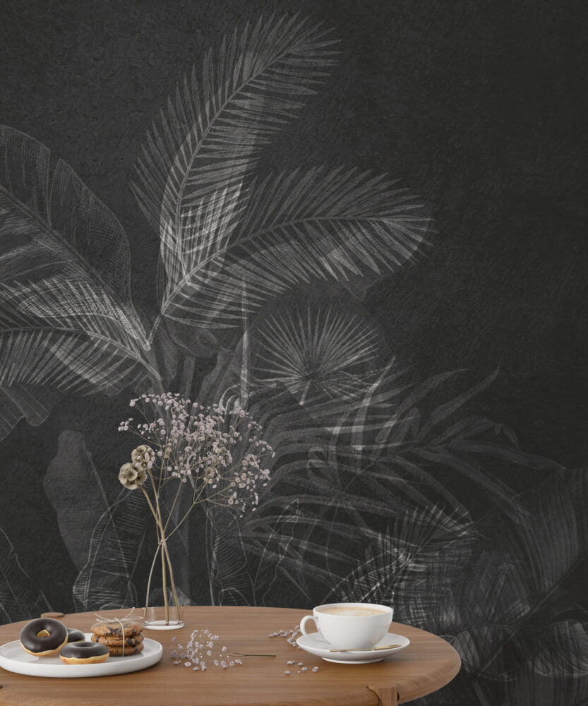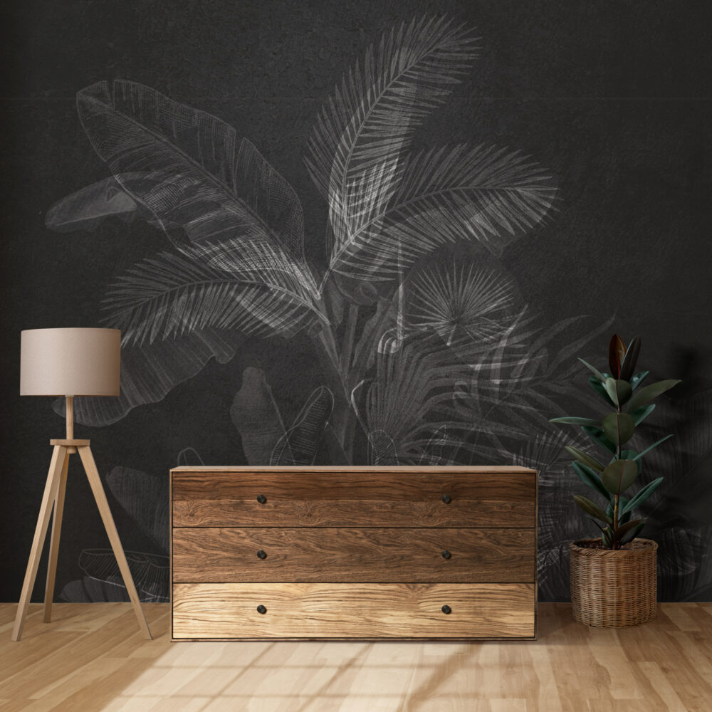 Siyah Beyaz Tropikal Yapraklar Duvar Kağıdı üretimi, uygulanmasını isteyeceğiniz boyut ve konumuna uygun olarak talepleriniz doğrultusunda size özel imal edilir.