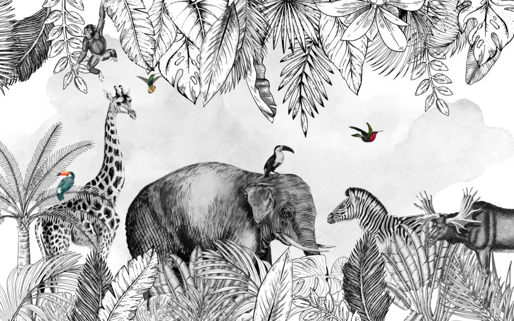 Siyah Beyaz Tropikal Yapraklı Hayvanlar Duvar Kağıdı üretimi, uygulanmasını isteyeceğiniz boyut ve konumuna uygun olarak talepleriniz doğrultusunda size özel imal edilir.
