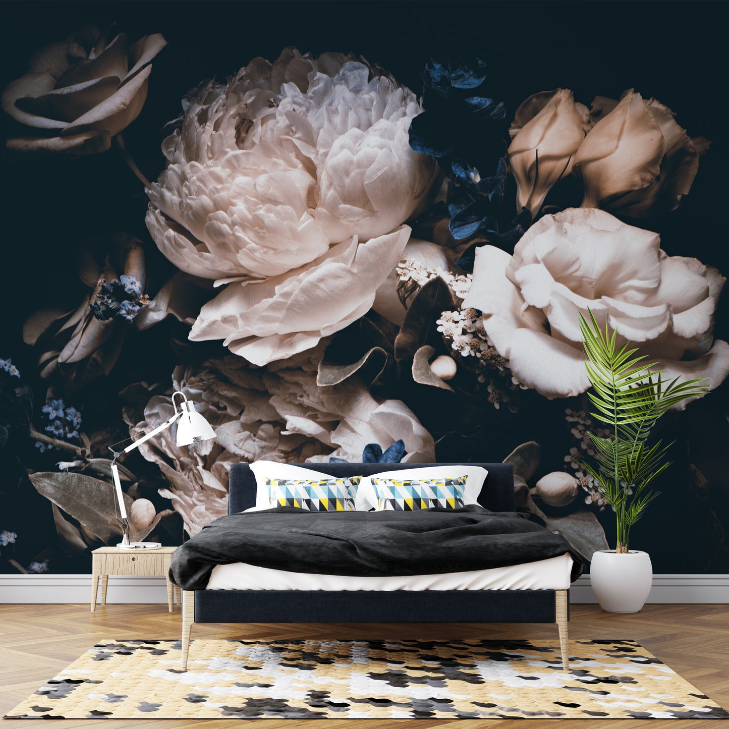 Siyah Fonda Şakayık Ve Güller Duvar Kağıdı