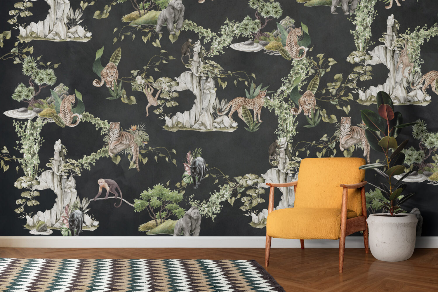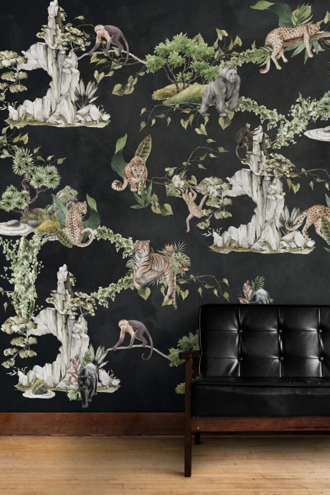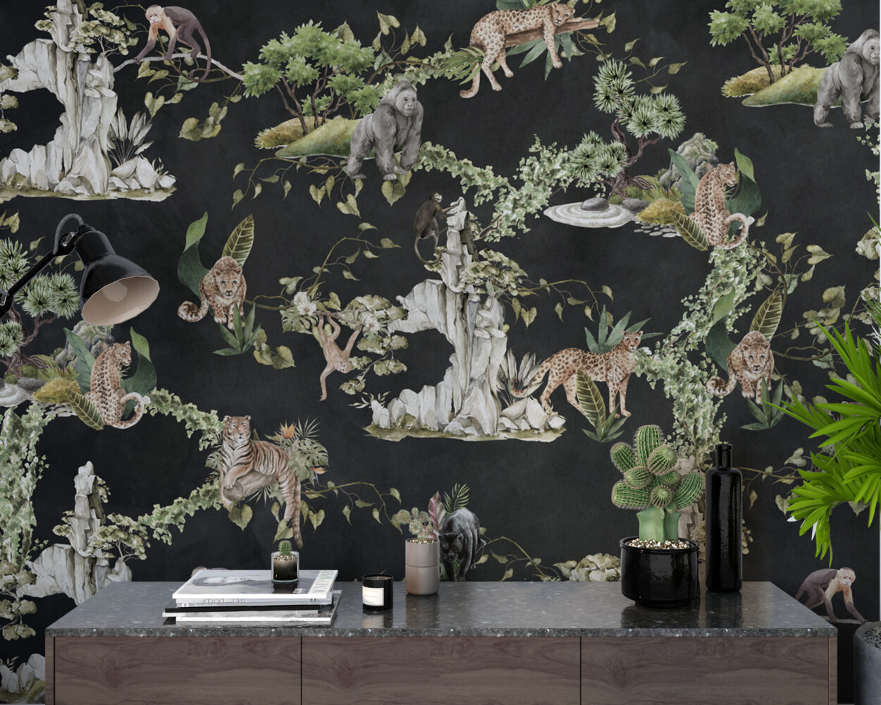 Siyah Zeminli Tropikal Hayvanlar Duvar Kağıdı üretimi, uygulanmasını isteyeceğiniz boyut ve konumuna uygun olarak talepleriniz doğrultusunda size özel imal edilir.