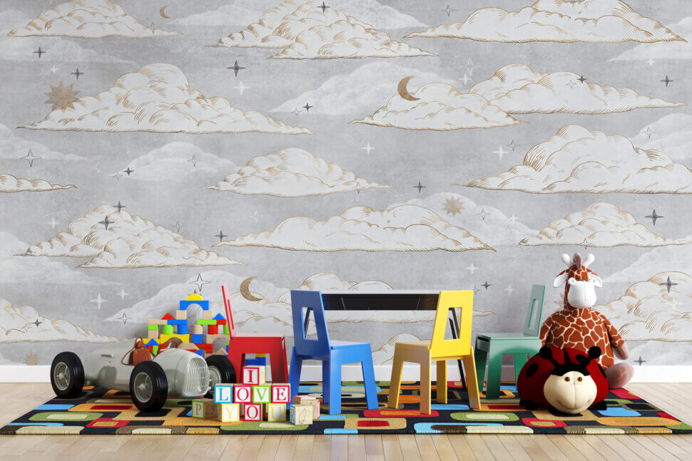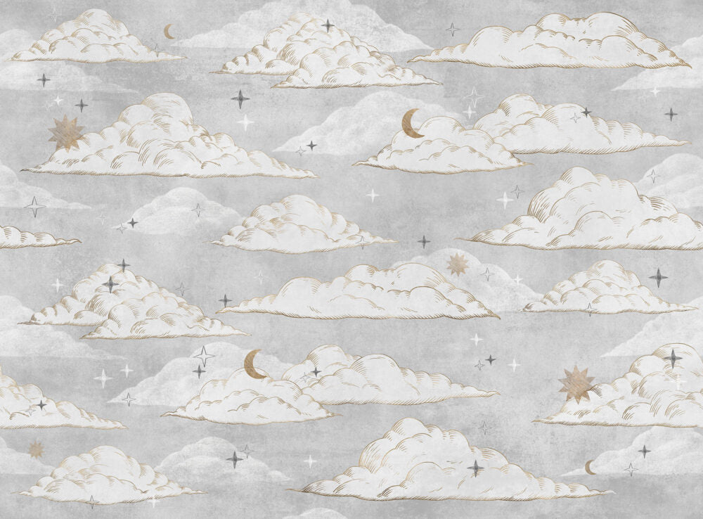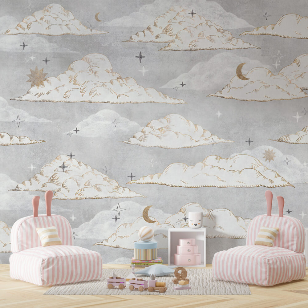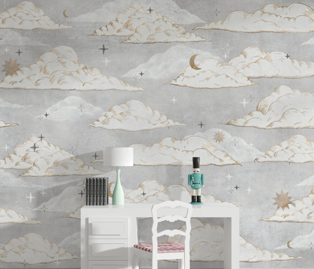 Soft Zeminli Ay, Yıldız ve Bulut Desenli 3D Duvar Kağıdı | Duvar Kağıdı Marketi üretimi, uygulanmasını isteyeceğiniz boyut ve konumuna uygun olarak talepleriniz doğrultusunda size özel imal edilir.