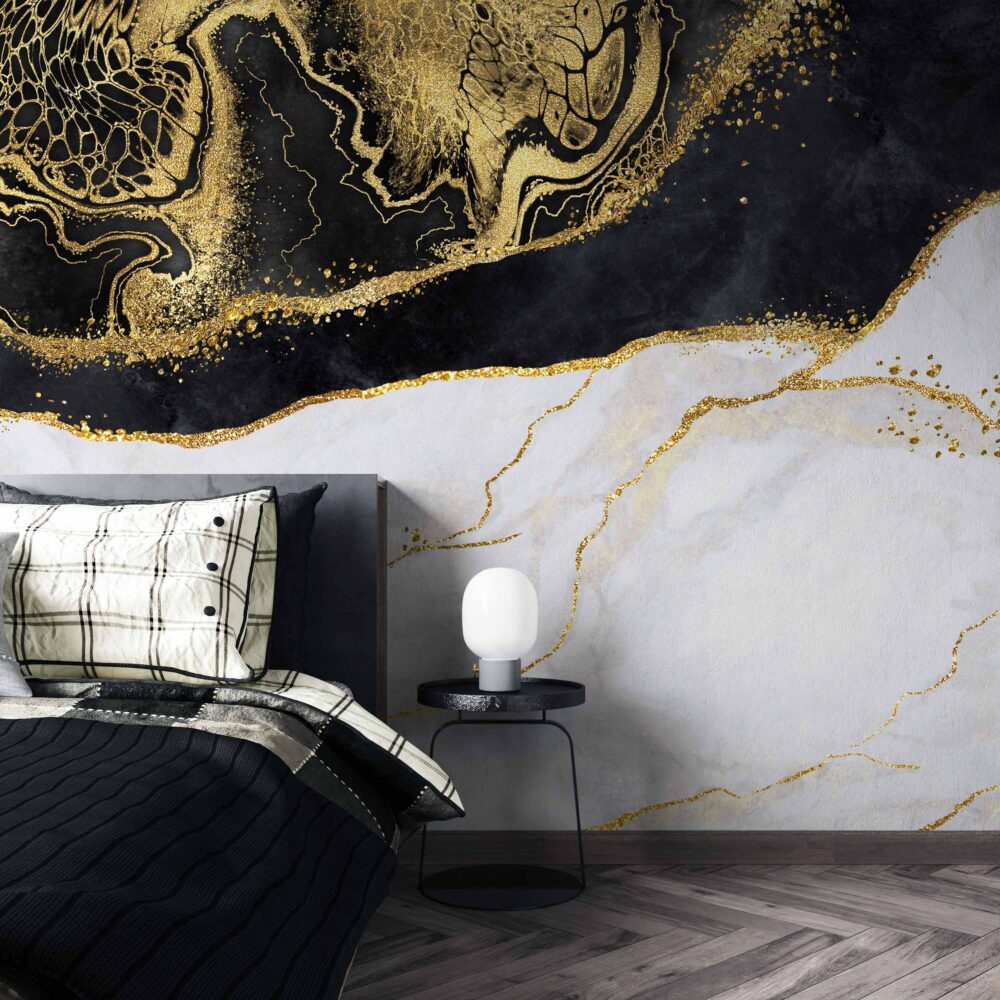 Soyut Gold Damarlı Siyah-Beyaz Mermer Desen Duvar Kağıdı üretimi, uygulanmasını isteyeceğiniz boyut ve konumuna uygun olarak talepleriniz doğrultusunda size özel imal edilir.