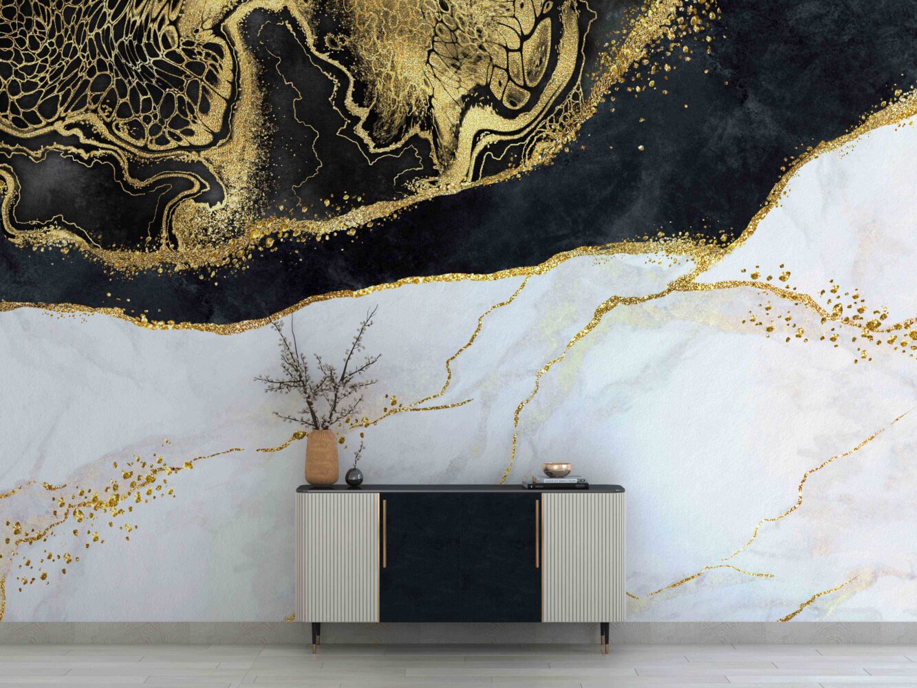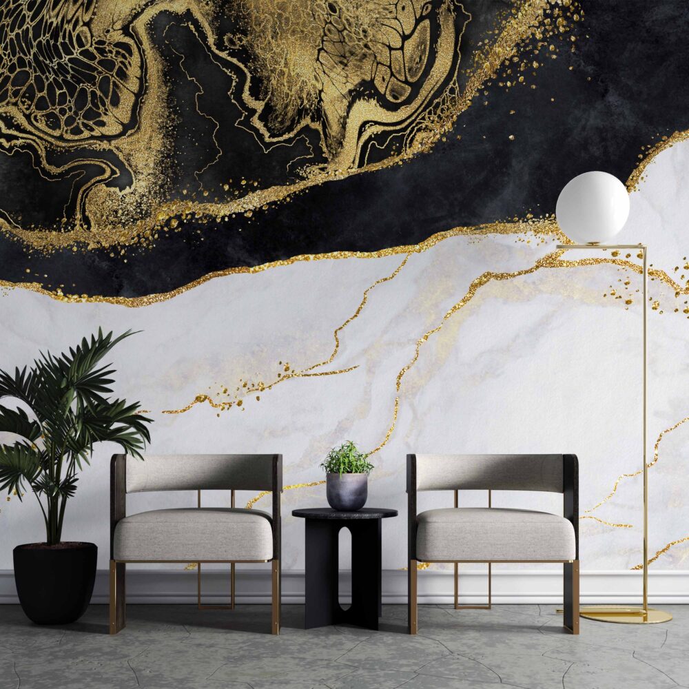 Soyut Gold Damarlı Siyah-Beyaz Mermer Desen Duvar Kağıdı