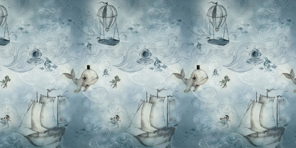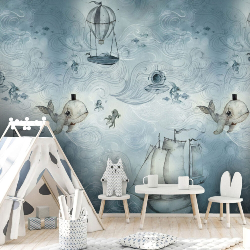 - Balonun Üzerindeki Balinalar 3D Duvar Kağıdı , 100-105cm genişliğinde parçalar halinde üretilmektedir.