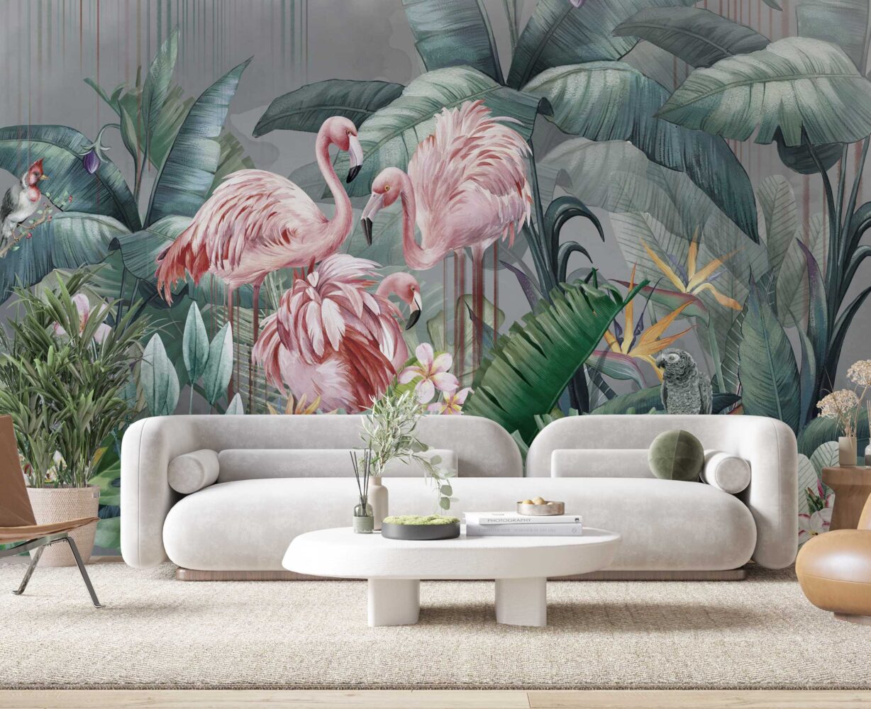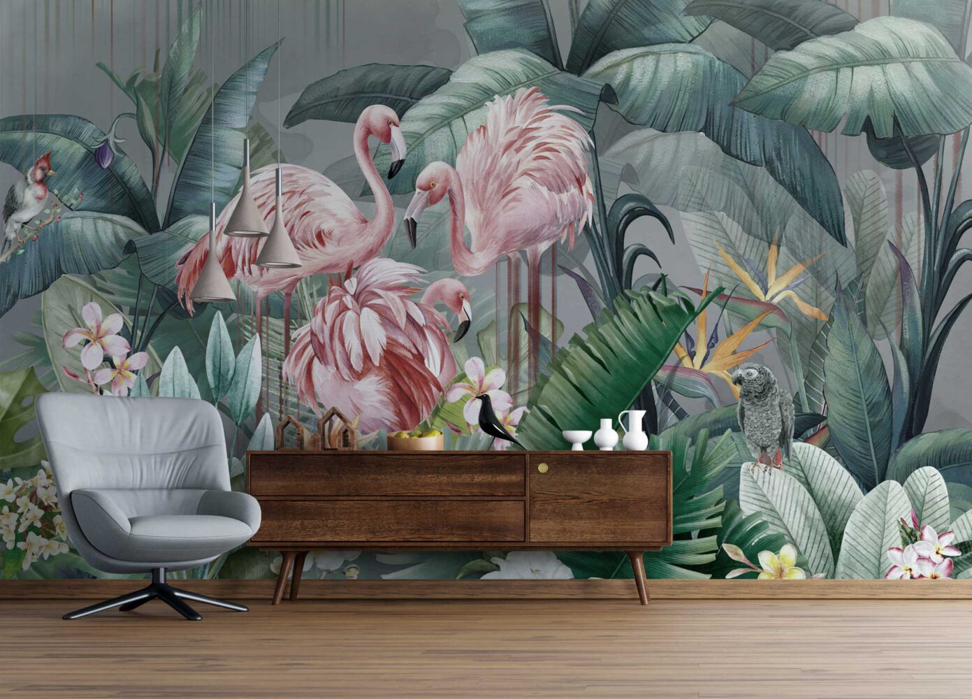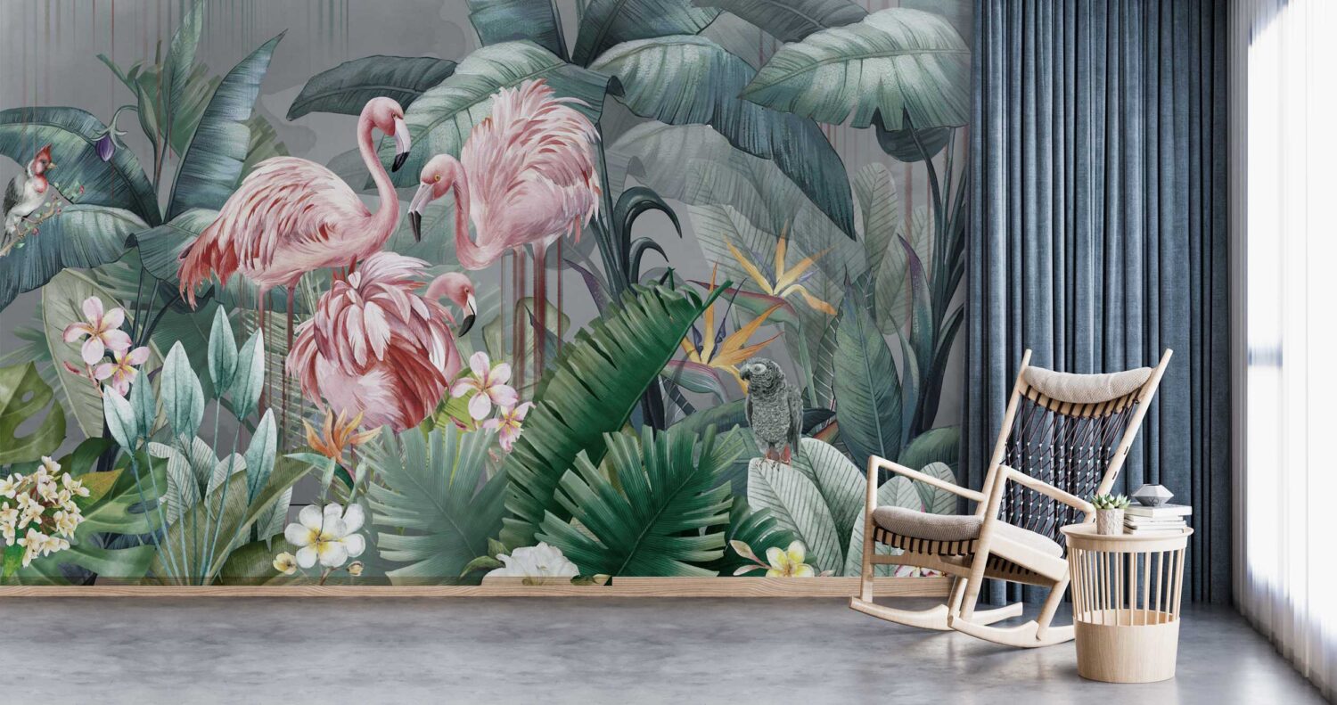 Tropikal Bahçede Flamingolu ve Papağanlı Duvar Kağıdı üretimi, uygulanmasını isteyeceğiniz boyut ve konumuna uygun olarak talepleriniz doğrultusunda size özel imal edilir.