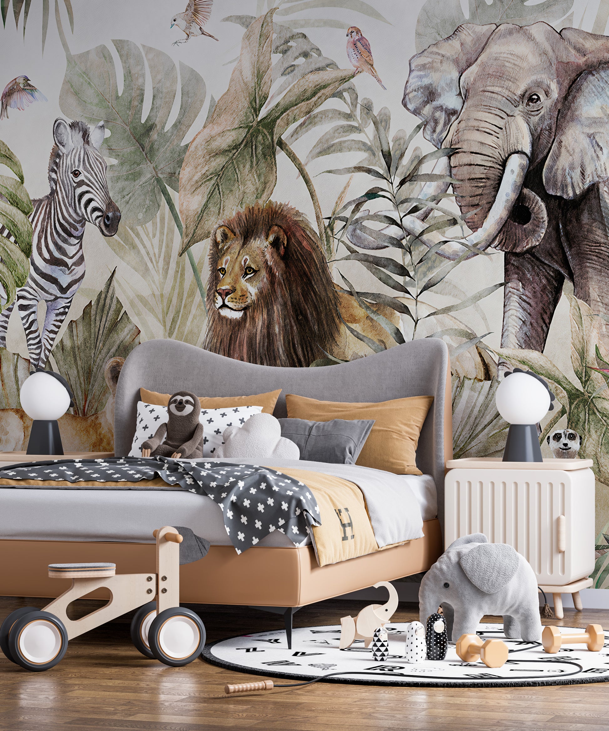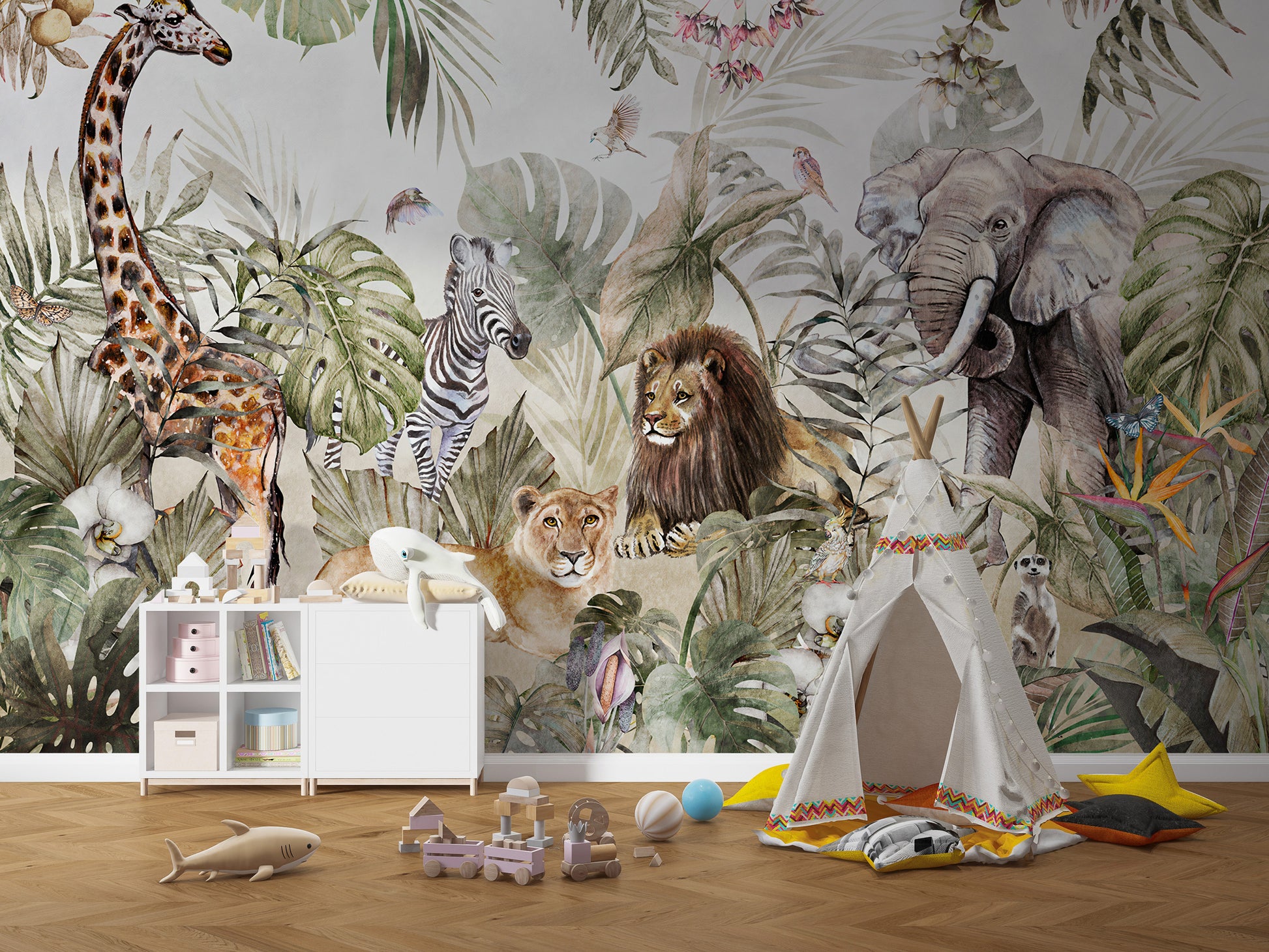 Tropikal Ormanda Hayvan Dostlar Duvar Kağıdı üretimi, uygulanmasını isteyeceğiniz boyut ve konumuna uygun olarak talepleriniz doğrultusunda size özel imal edilir.