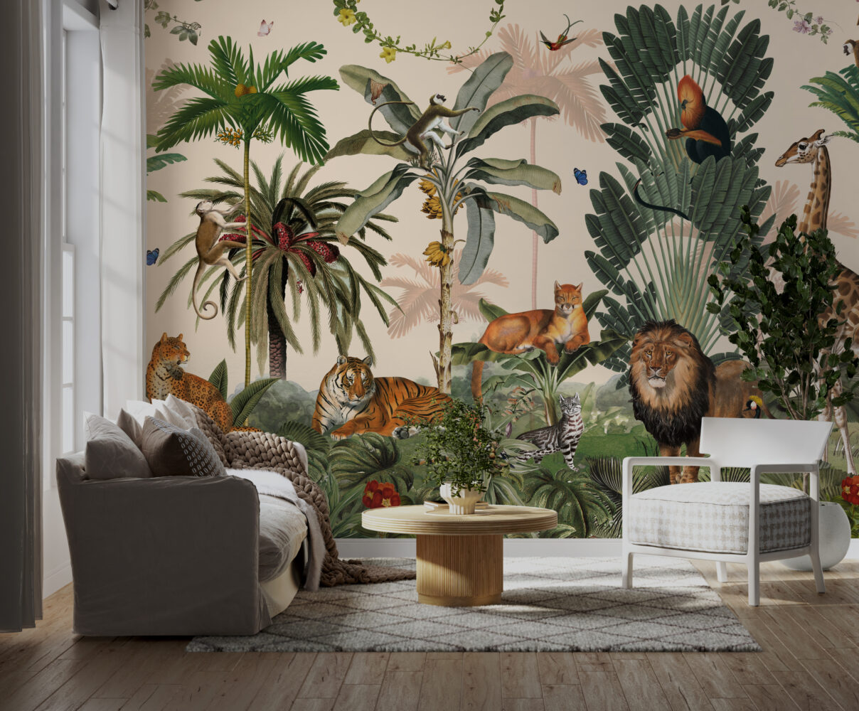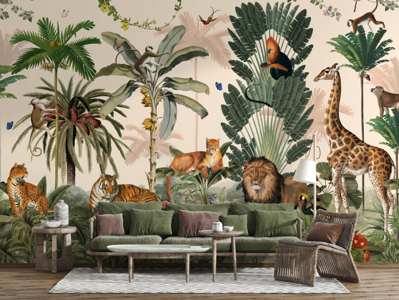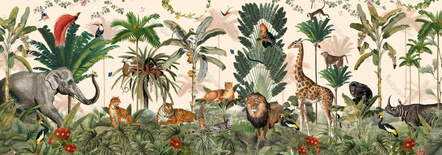 Tropikal Ormanda Hayvanlar Alemi Bej Zemin Duvar Kağıdı üretimi, uygulanmasını isteyeceğiniz boyut ve konumuna uygun olarak talepleriniz doğrultusunda size özel imal edilir.