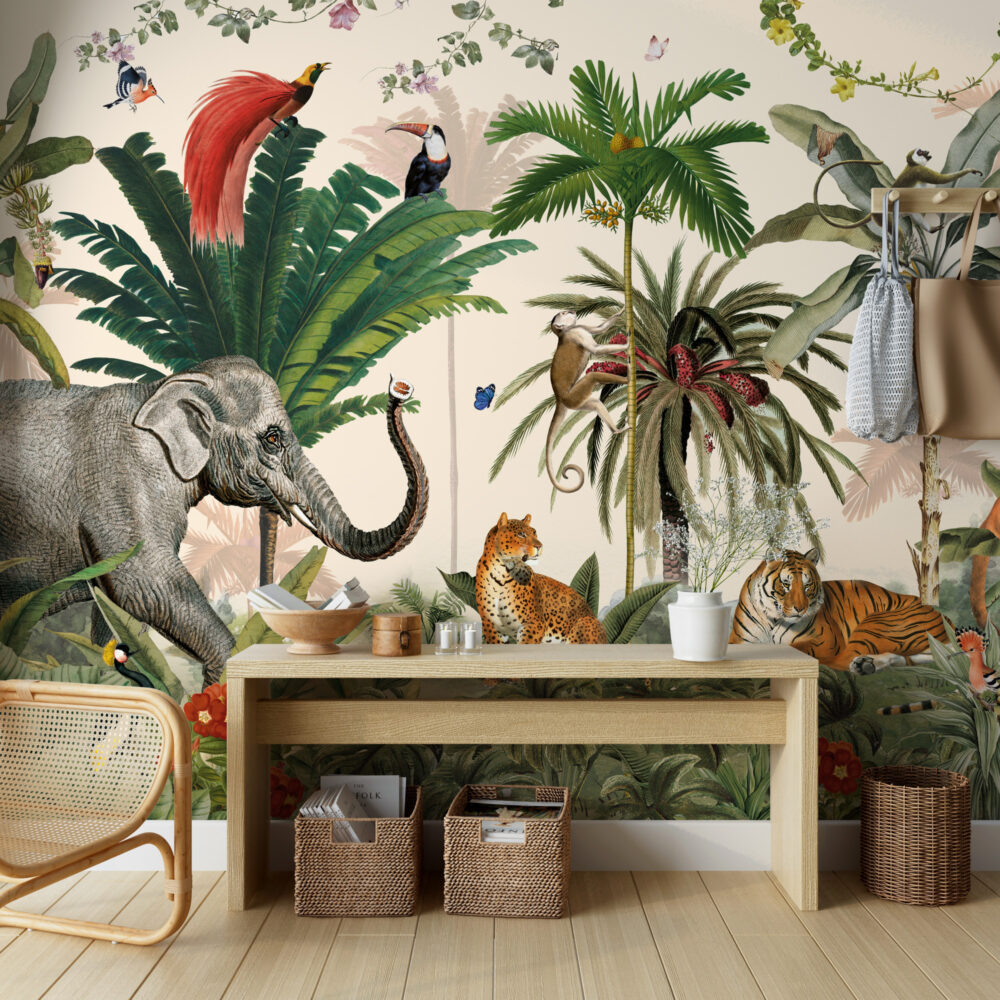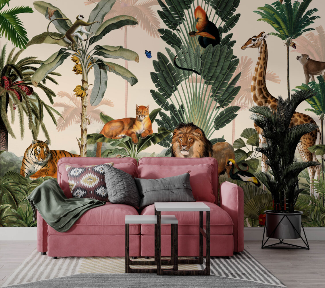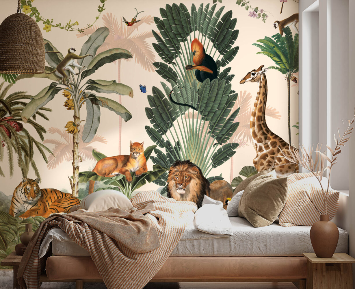 Tropikal Ormanda Hayvanlar Alemi Bej Zemin Duvar Kağıdı üretimi, uygulanmasını isteyeceğiniz boyut ve konumuna uygun olarak talepleriniz doğrultusunda size özel imal edilir.