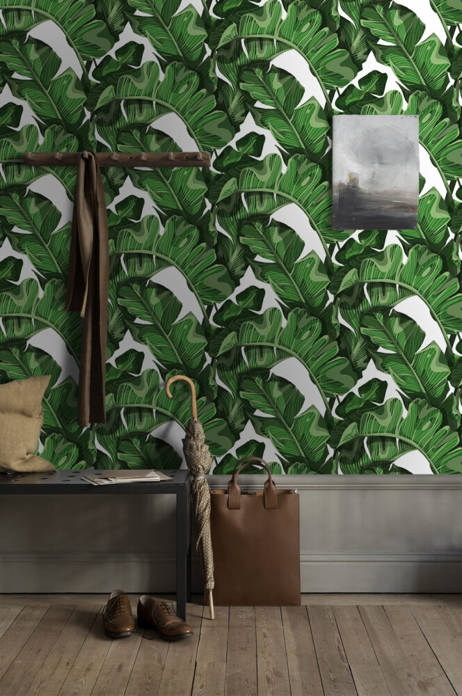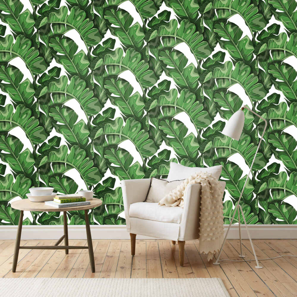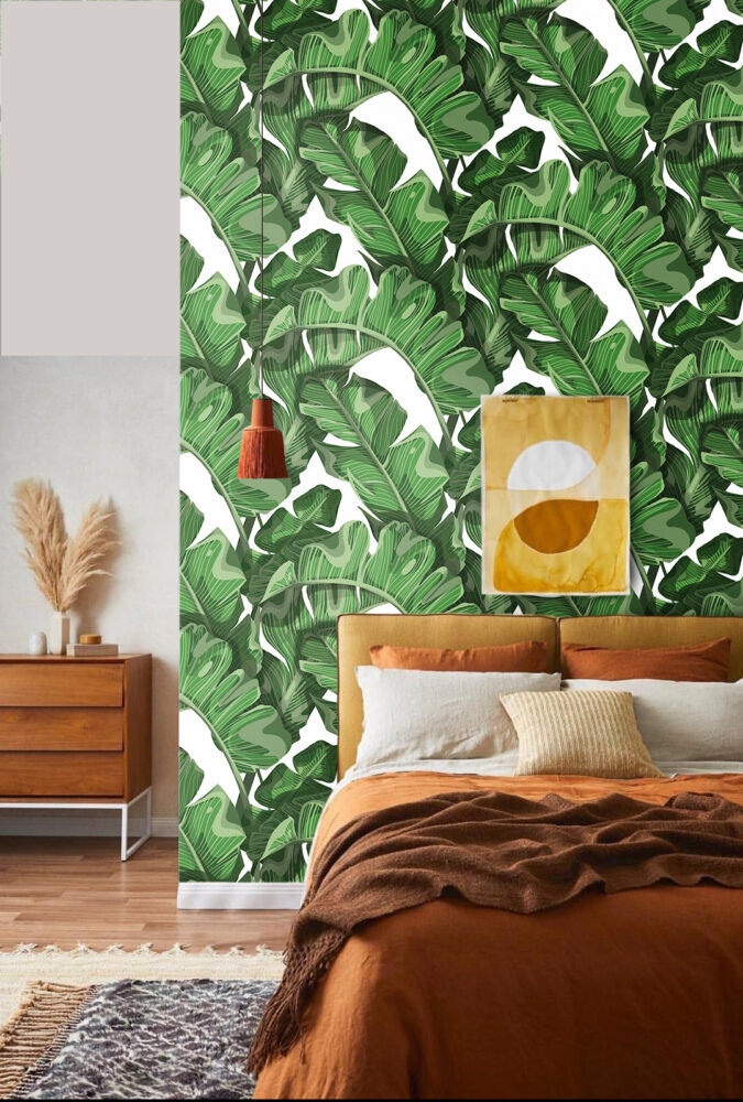 Tropikal Yapraklar Deseni Duvar Kağıdı üretimi, uygulanmasını isteyeceğiniz boyut ve konumuna uygun olarak talepleriniz doğrultusunda size özel imal edilir.