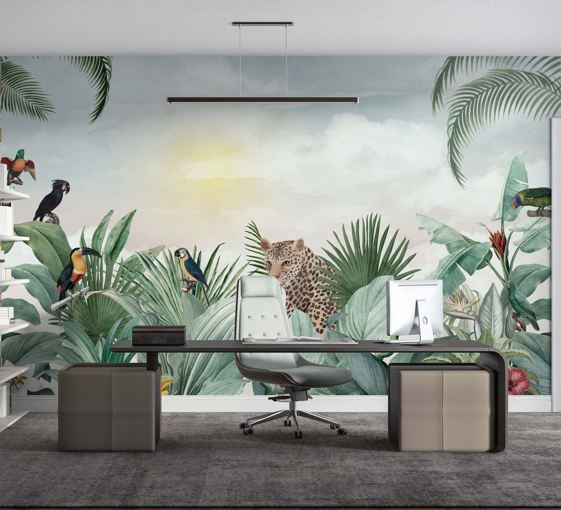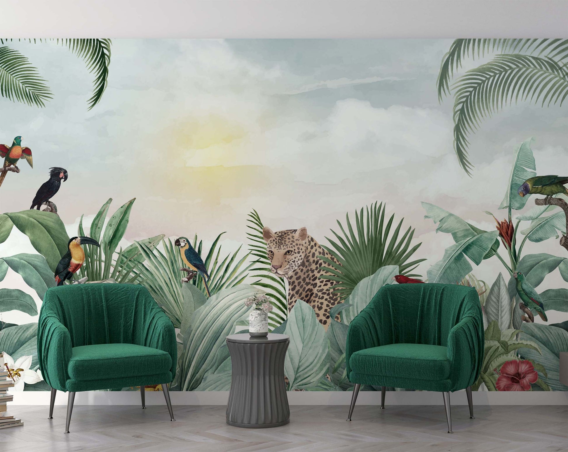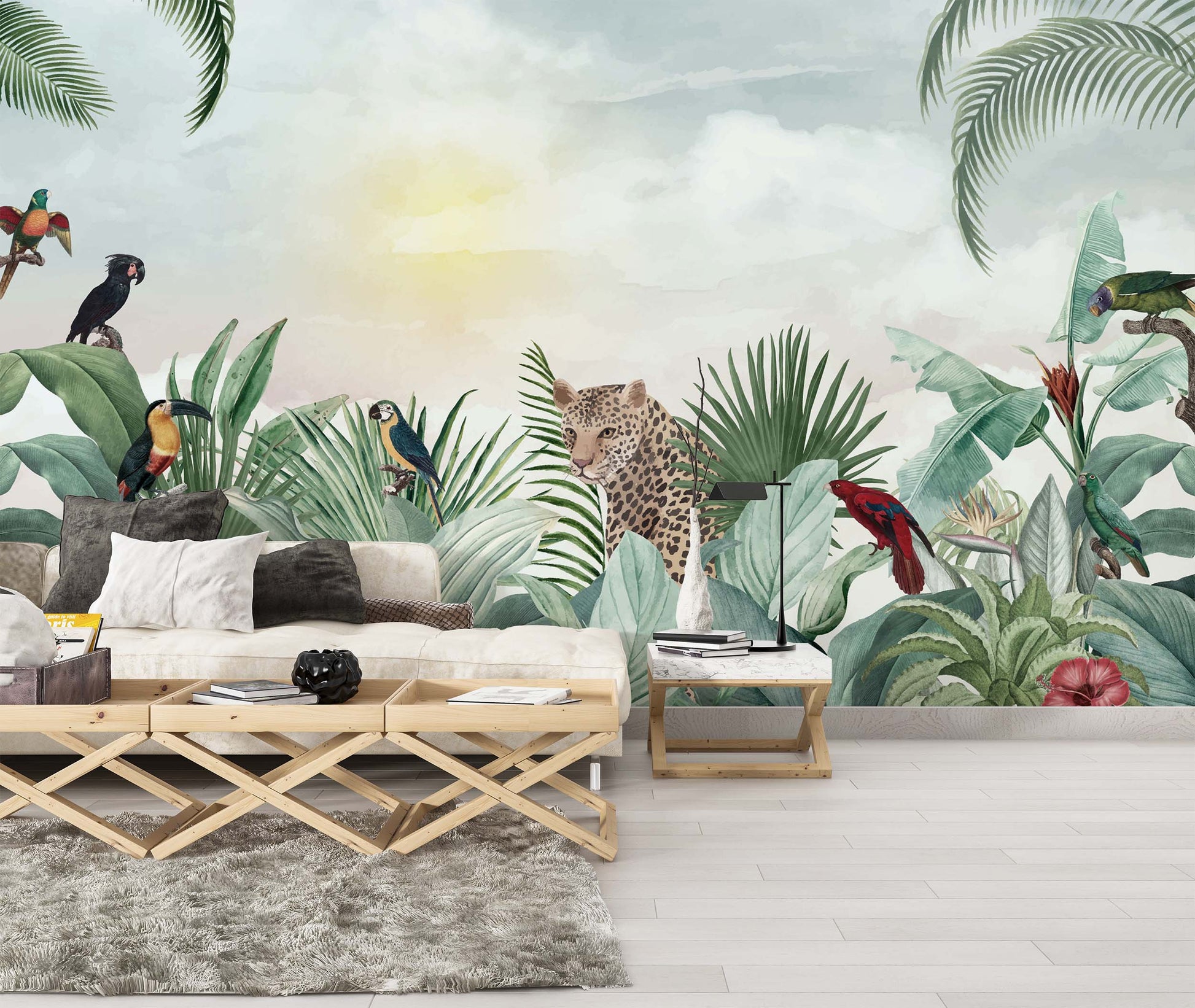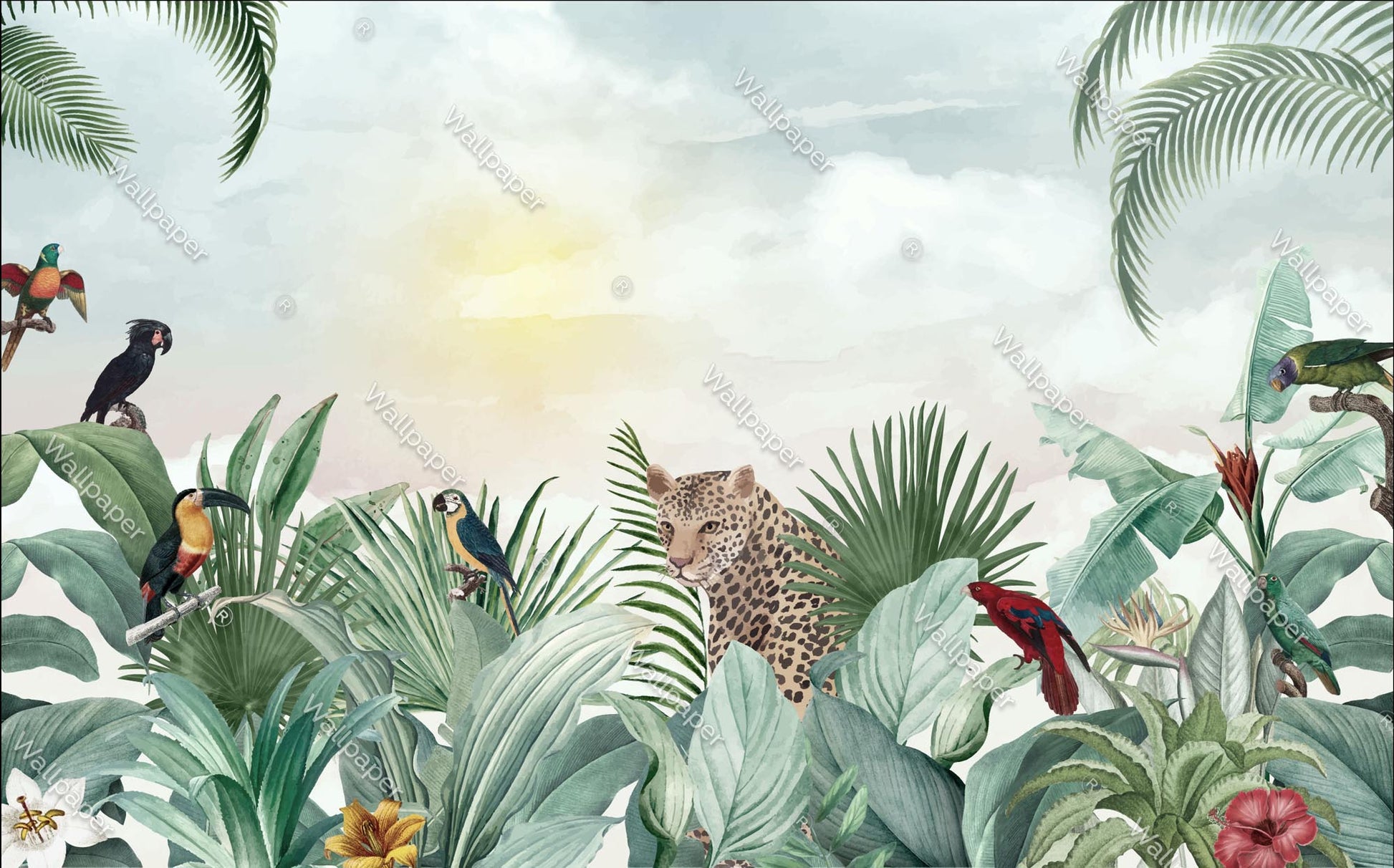 Tropikal Yapraklar Leopar ve Kuşlar Duvar Kağıdı üretimi, uygulanmasını isteyeceğiniz boyut ve konumuna uygun olarak talepleriniz doğrultusunda size özel imal edilir.