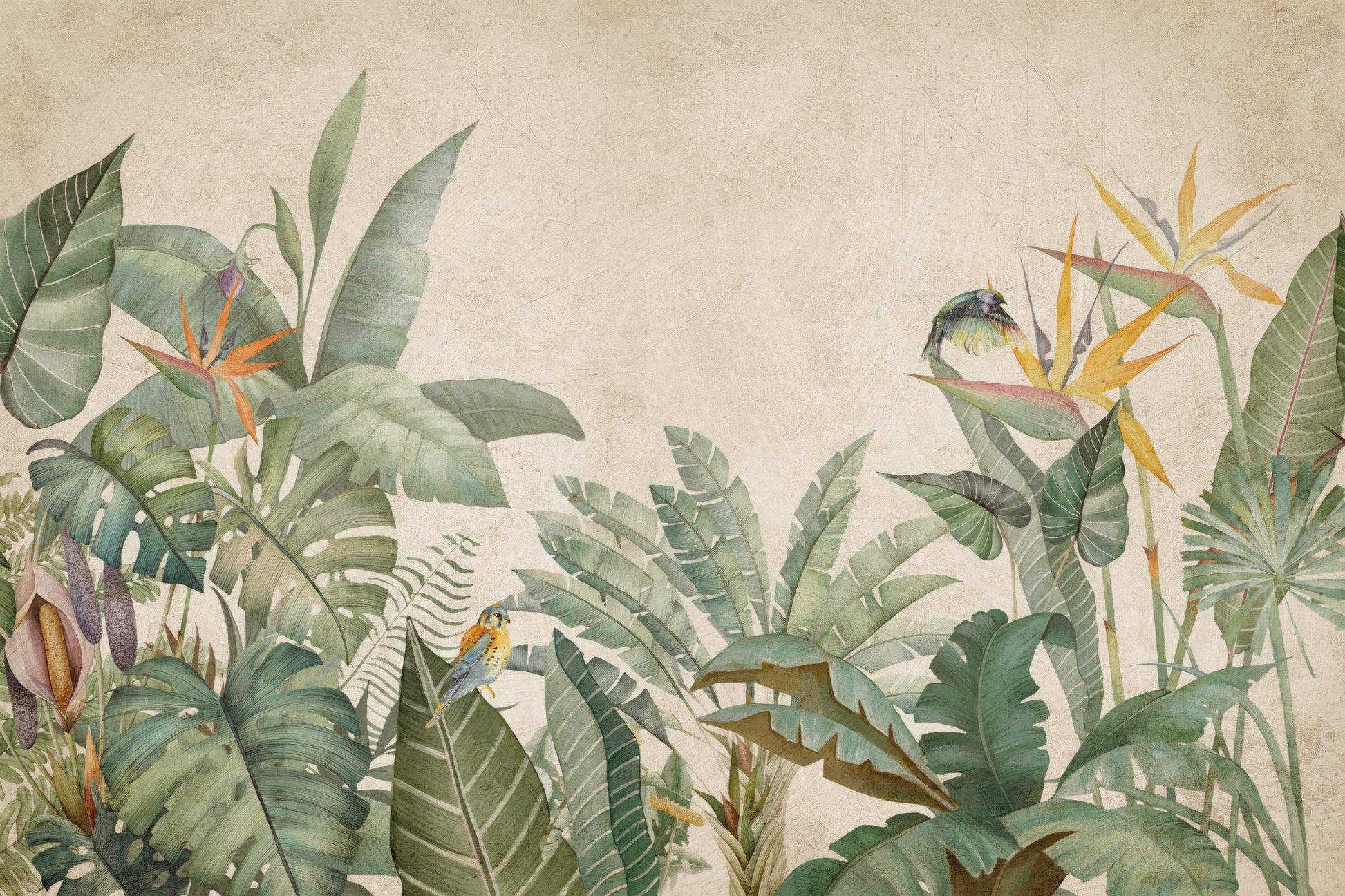 Tropikal Yapraklar ve Orman Çiçekleri Duvar Kağıdı üretimi, uygulanmasını isteyeceğiniz boyut ve konumuna uygun olarak talepleriniz doğrultusunda size özel imal edilir.